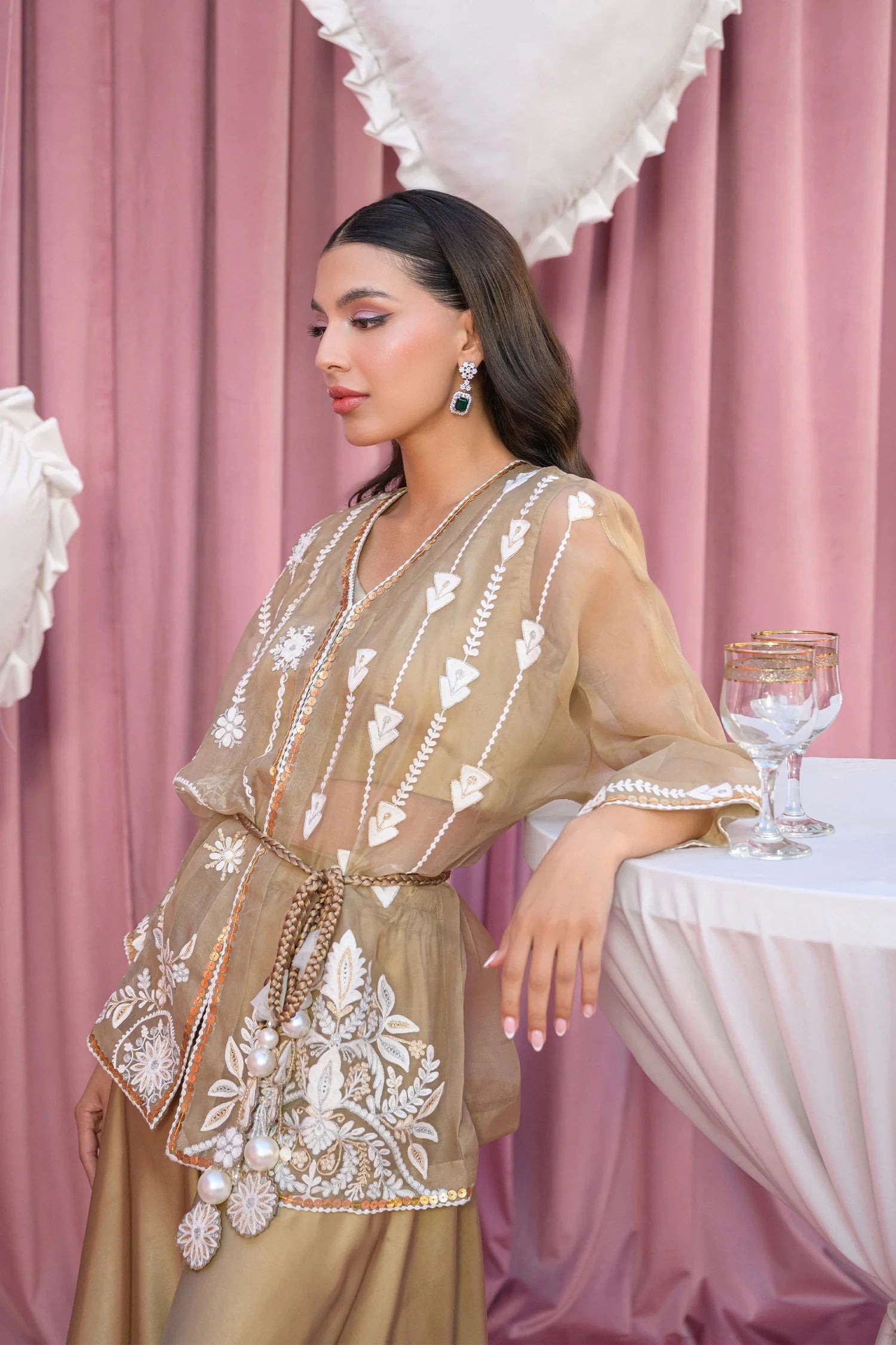 A short cape–style jacket crafted in pure Kittan organza, paired with elegant charmeuse silk flared pants. Rendered in soft beige tones, this ensemble captures the serene charm of an Eid morning. It comes with a blouse. The jacket is intricately adorned with detailed aari embroidery and delicate sequins, finished with a heavily embellished handmade tassel for a refined statement.