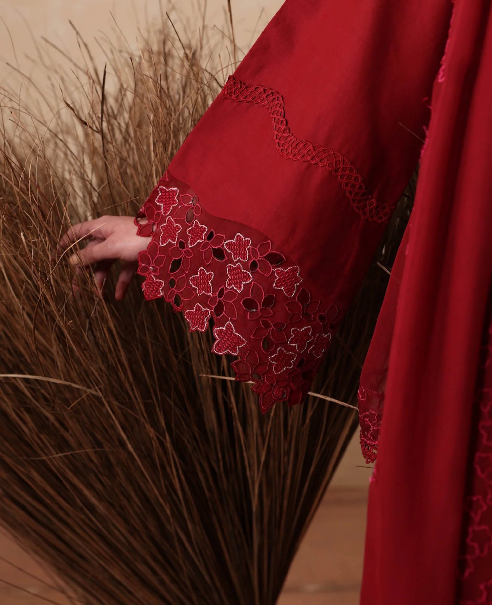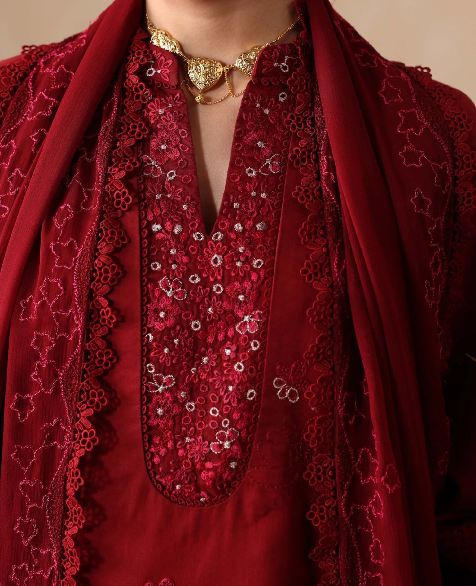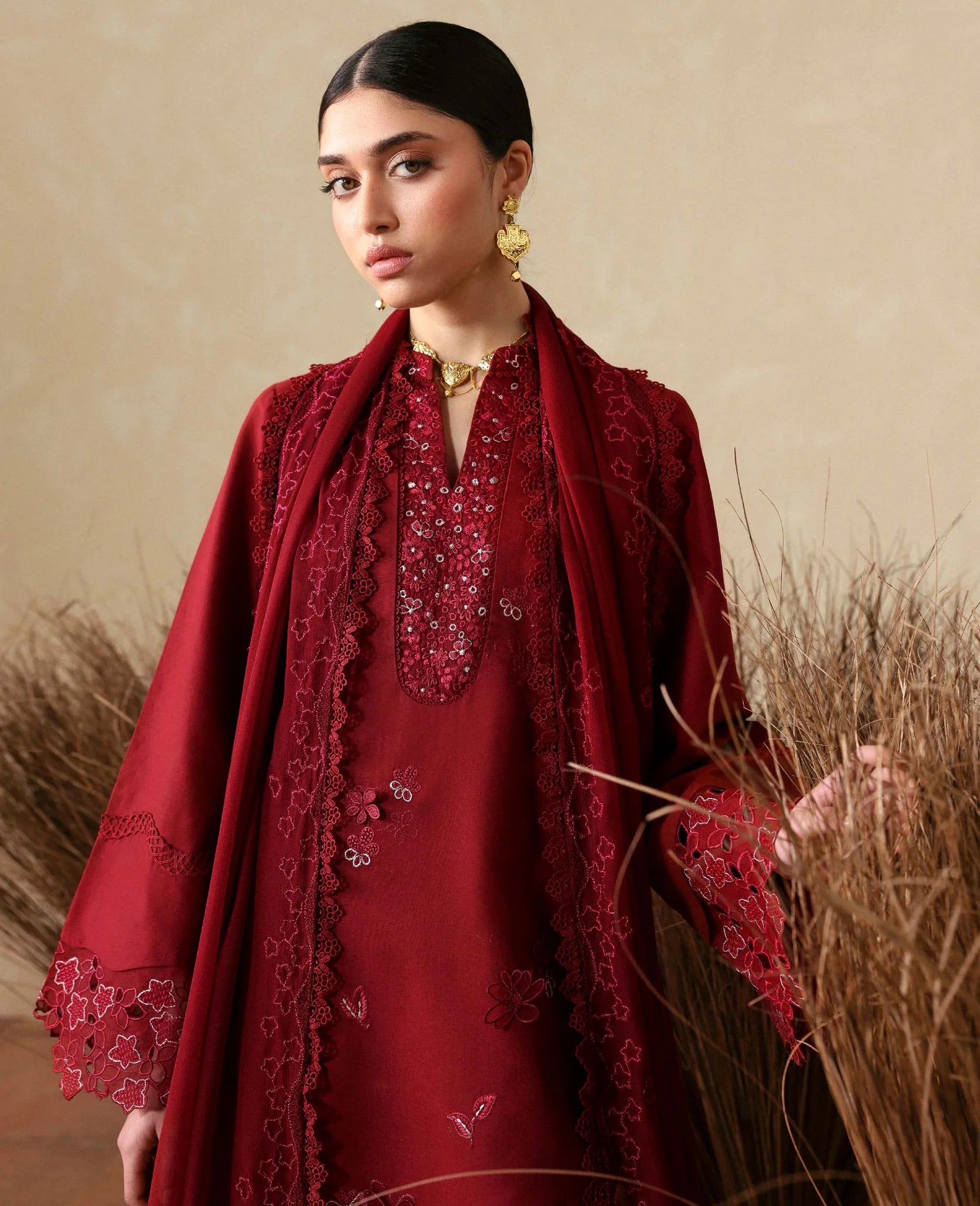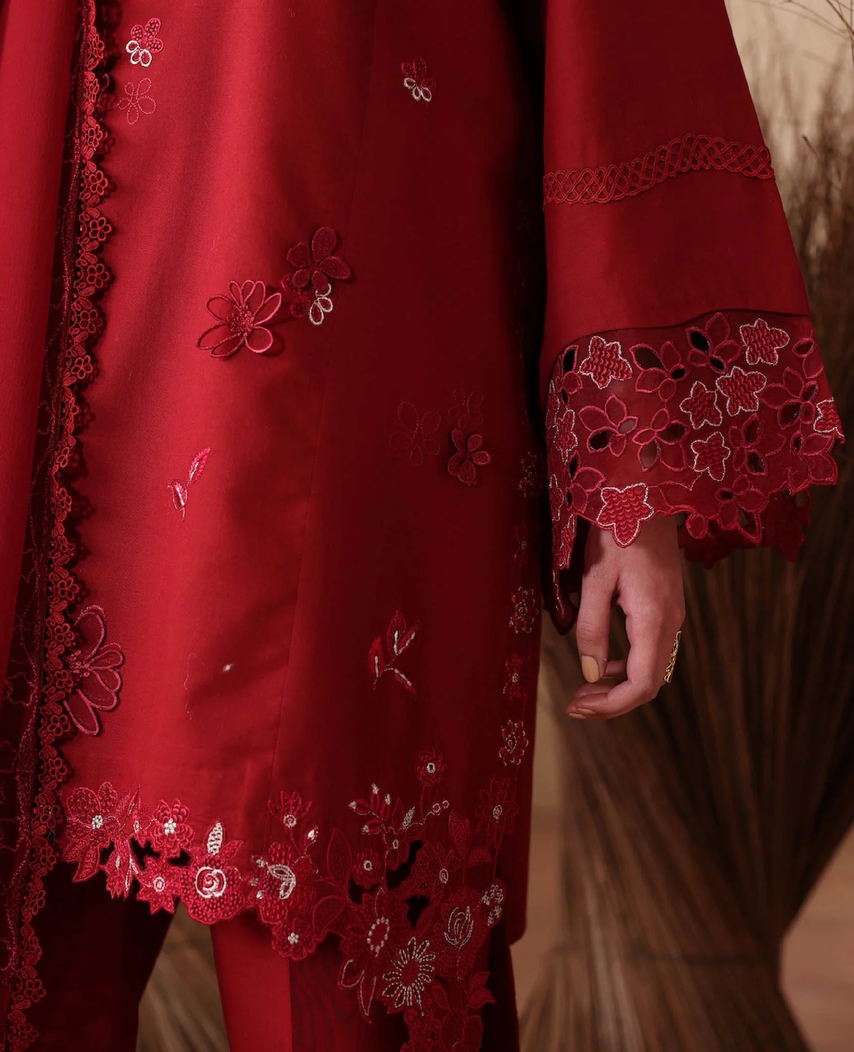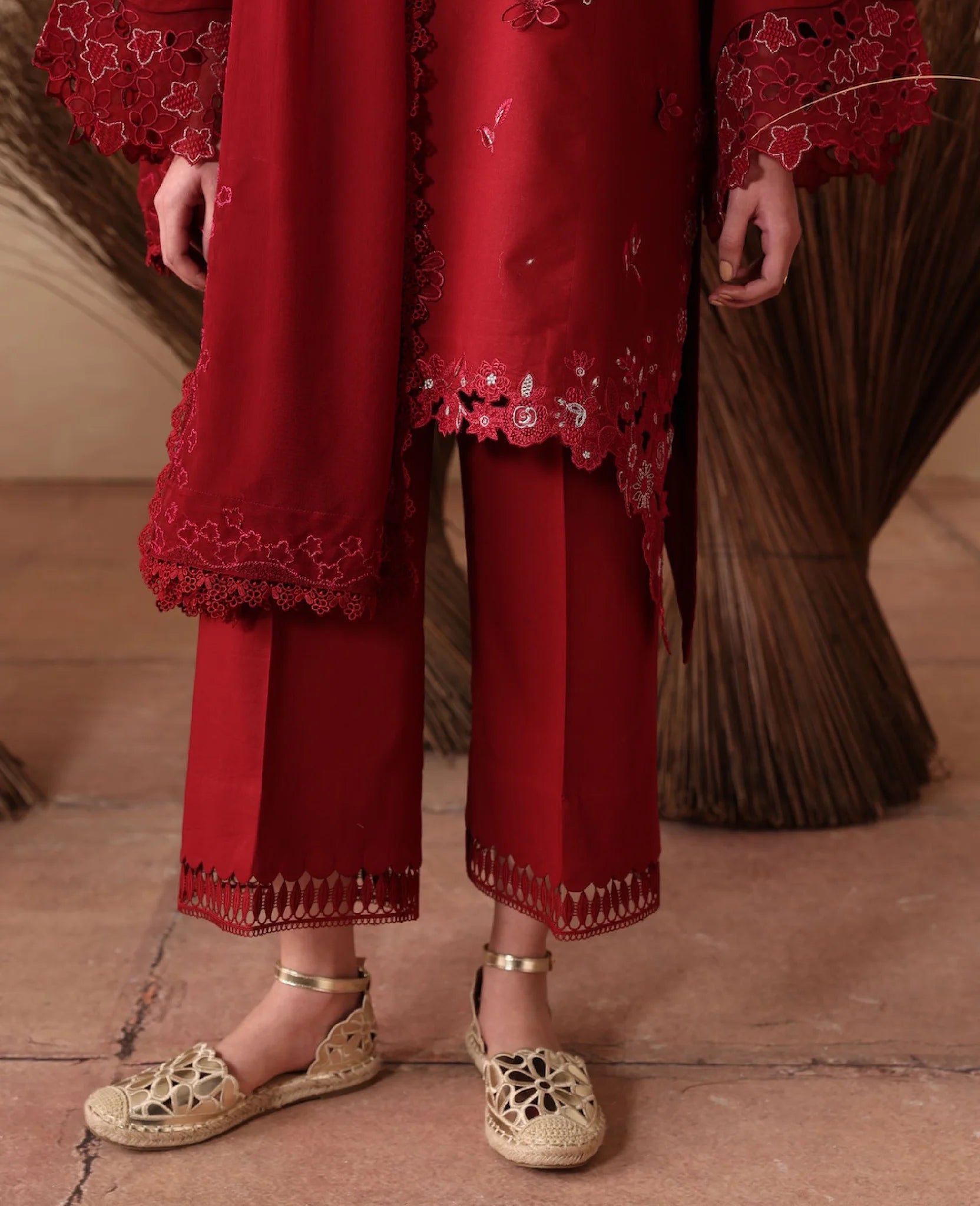A chic short lawn shirt in radiant red hue with a modern drop-corner cut, adorned with intricate tilla and resham embroidery in monochrome tones with shocking pink accents. Paired with wide-leg cambric culottes and a breezy chiffon dupatta for an effortlessly elegant summer look.