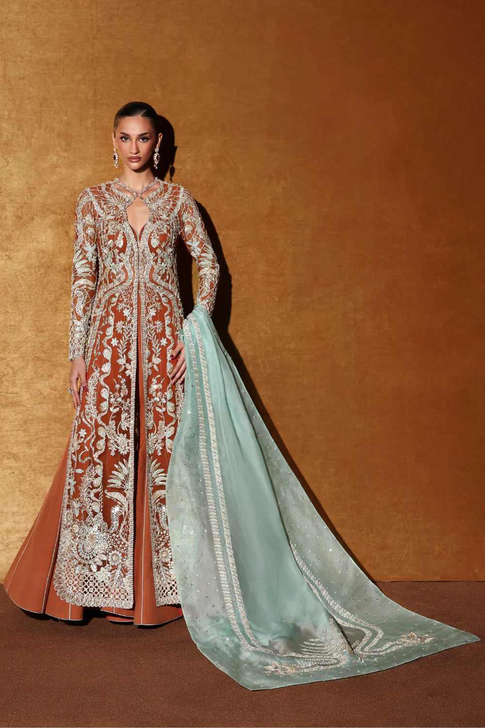 In a striking burnt orange tone, this front-open jacket brings together everything we love, a modern silhouette, delicate cutwork on the hem, and a couture finish on soft net fabric. The color itself makes a statement, but it’s the pairing with that aqua dupatta that truly sets it apart balancing vibrance with grace, making it perfect for wedding festivities or any occasion where you want to stand out beautifully.