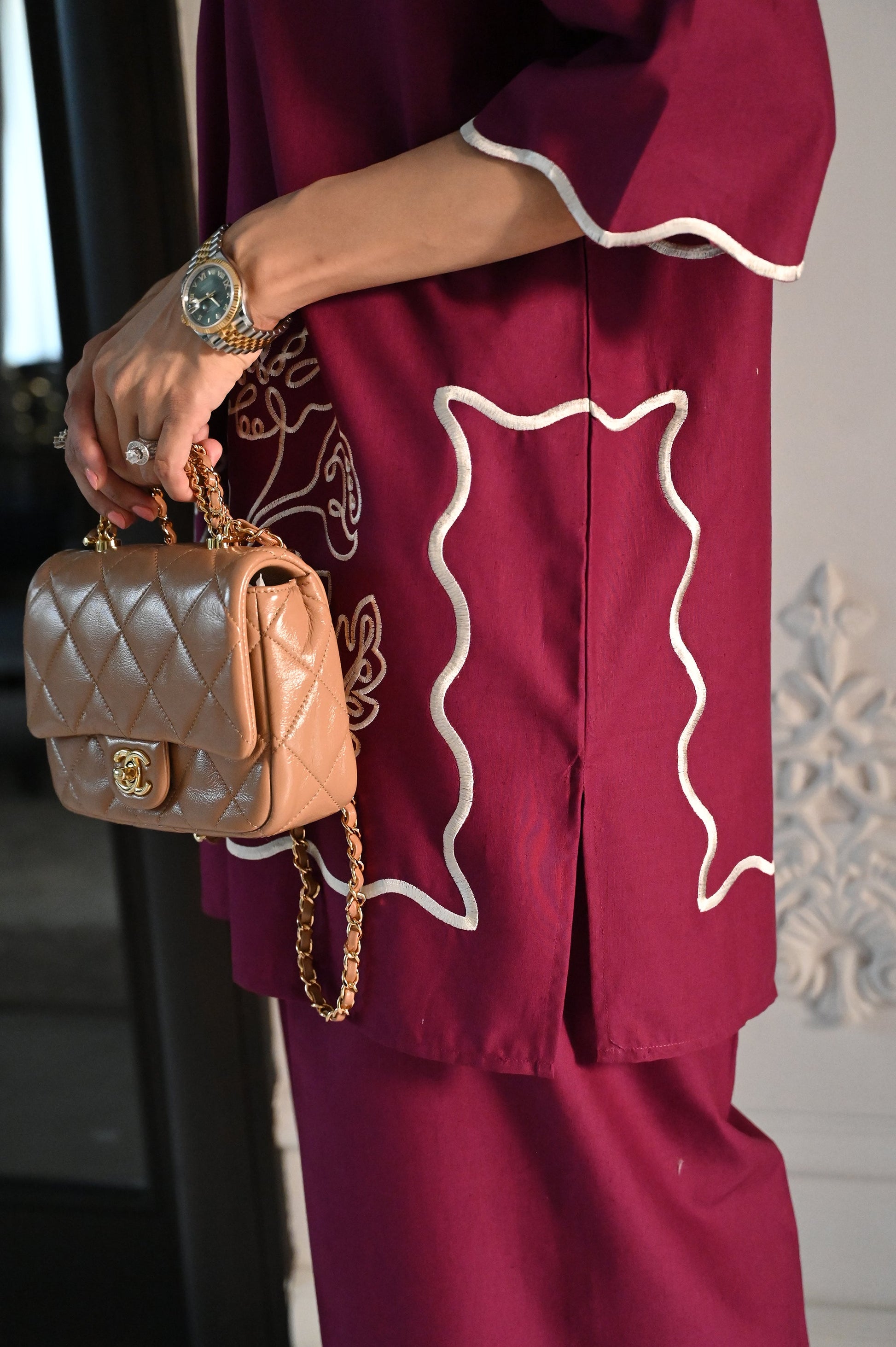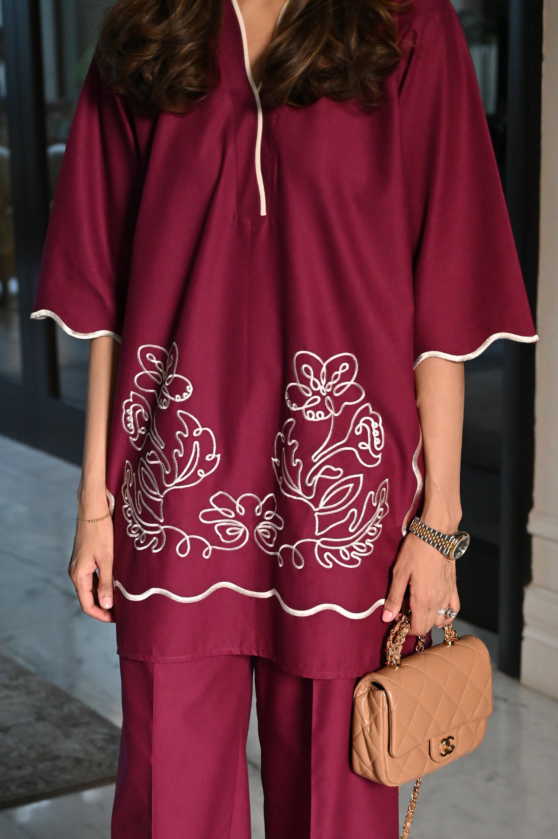 A plum two-piece ensemble featuring a straight kurta with white embroidered floral motifs and scalloped edging at the hem. The kurta has a subtle V-slit neckline with white piping for contrast. It is paired with wide-leg trousers finished with matching scalloped detailing, giving the outfit a modern yet elegant look.
