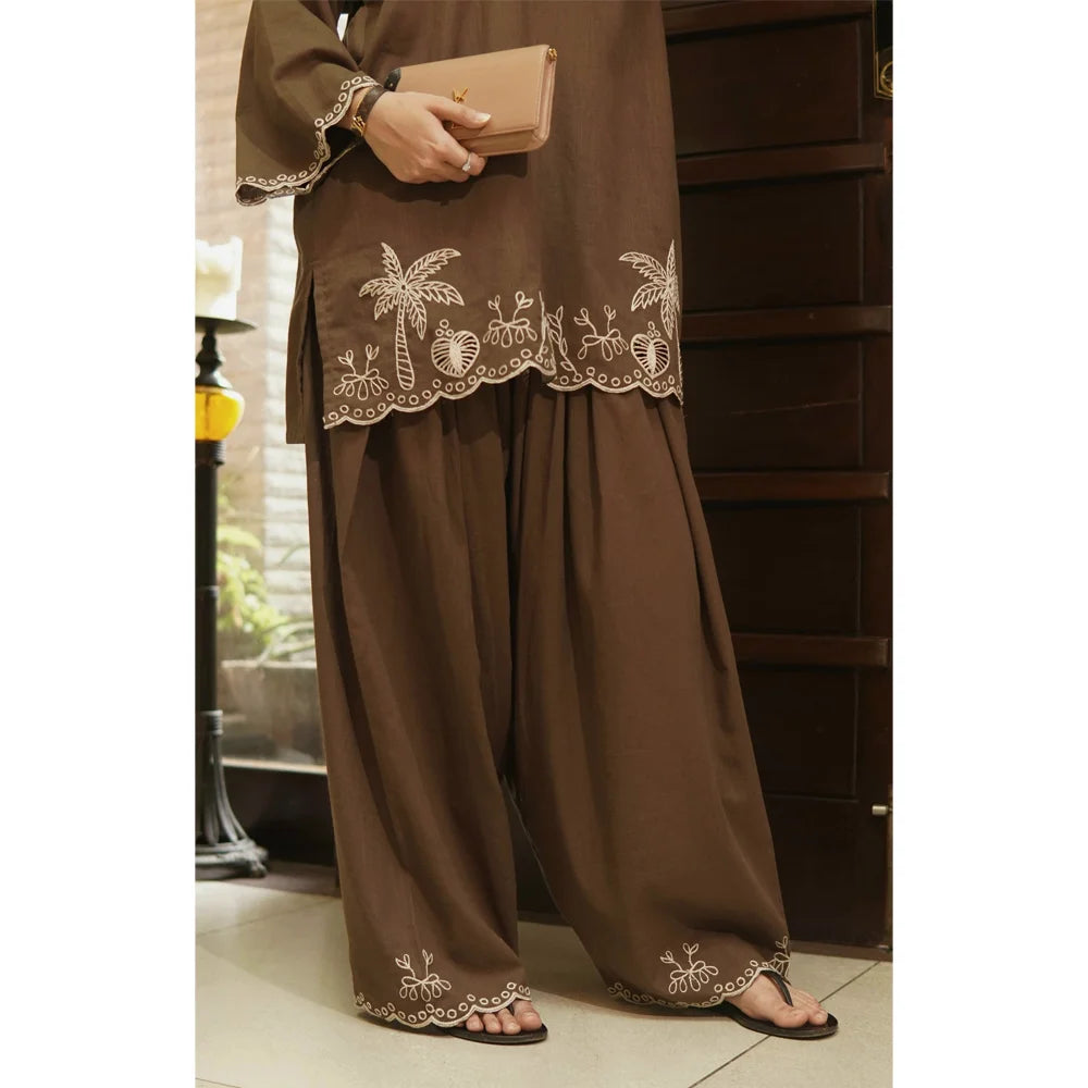 Breathable loose cut drop shoulder kurta comes with stunning anchor and resham Palm Trees and Maple leaves embroidery on daman