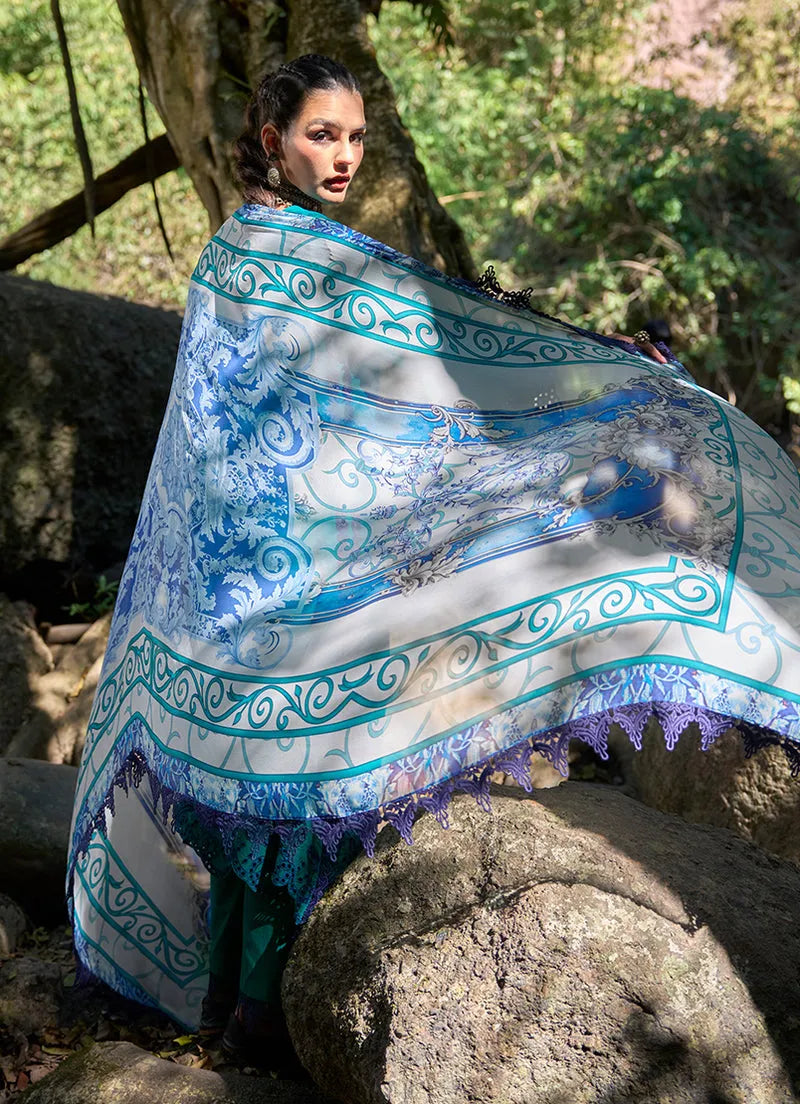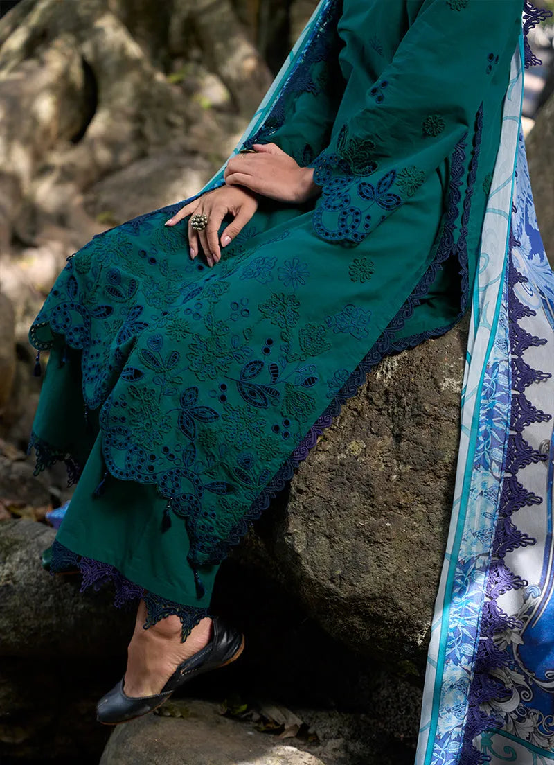 This unstitched pure cotton lawn shirt is showcased in a deep viridian green tone, featuring finely detailed floral motifs scattered across the fabric to create a balanced and harmonious surface design. The pattern is complemented by ornate borders along the edges, adding depth and visual contrast while maintaining a cohesive look. Paired with a pure cotton cambric trouser and a chiffon dupatta with coordinated prints, the ensemble presents a breathable composition with a strong, nature-inspired fabric aesthetic ideal for summer wear.