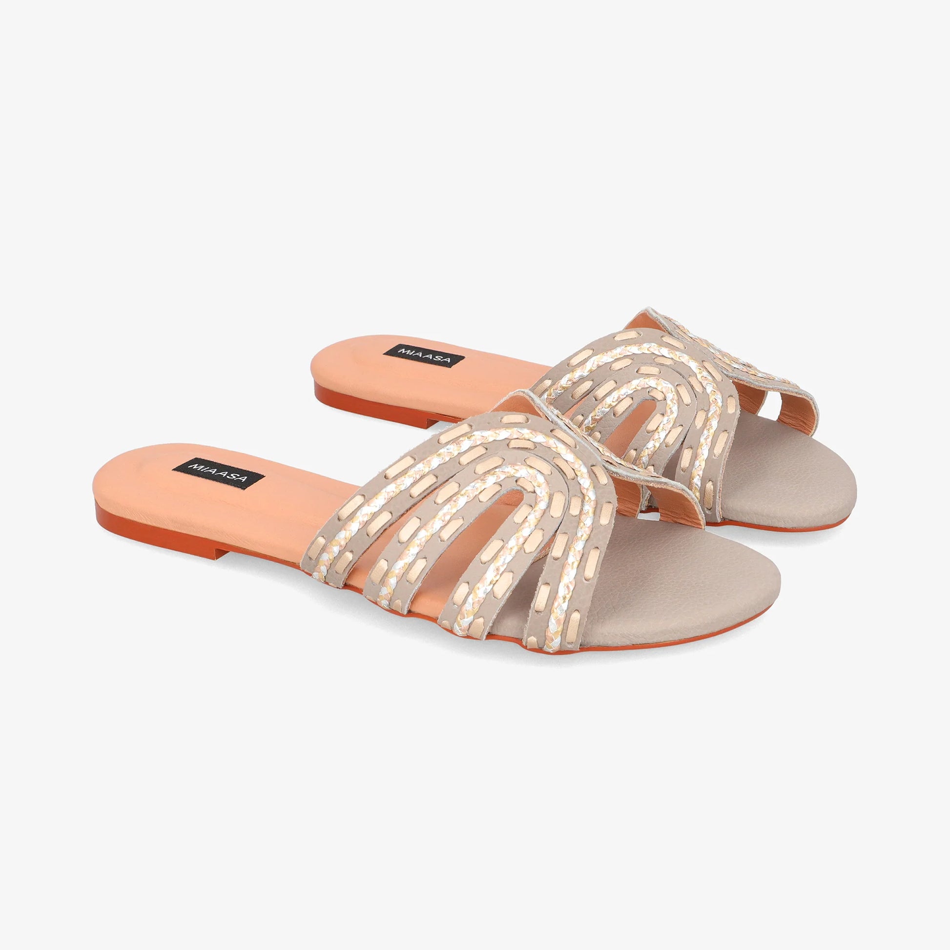 Our signature scalloped 'Zee' slide crafted in a supple leather, with whipstitch details in dull gold. This closet classic will be your staple for those summer days ahead.