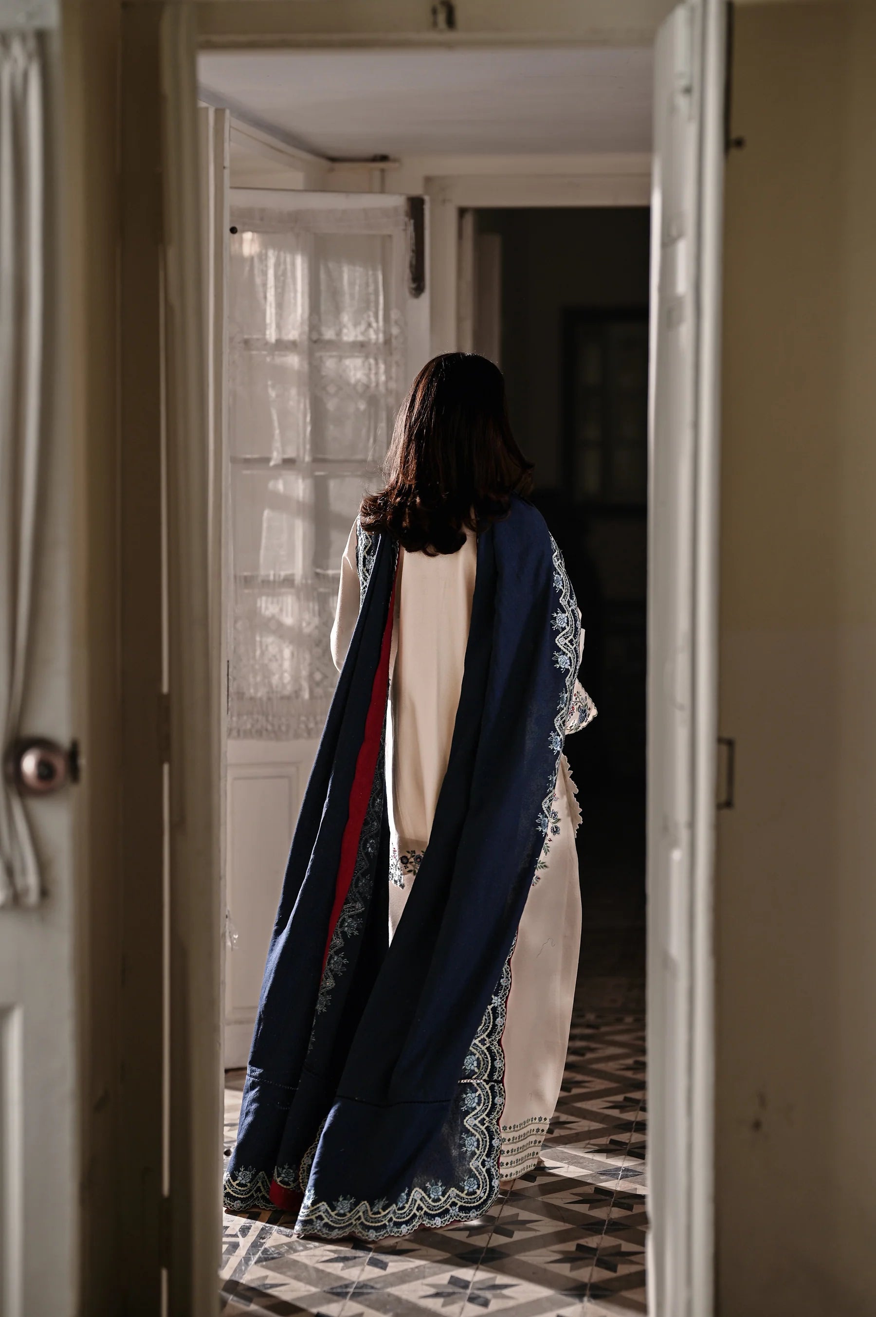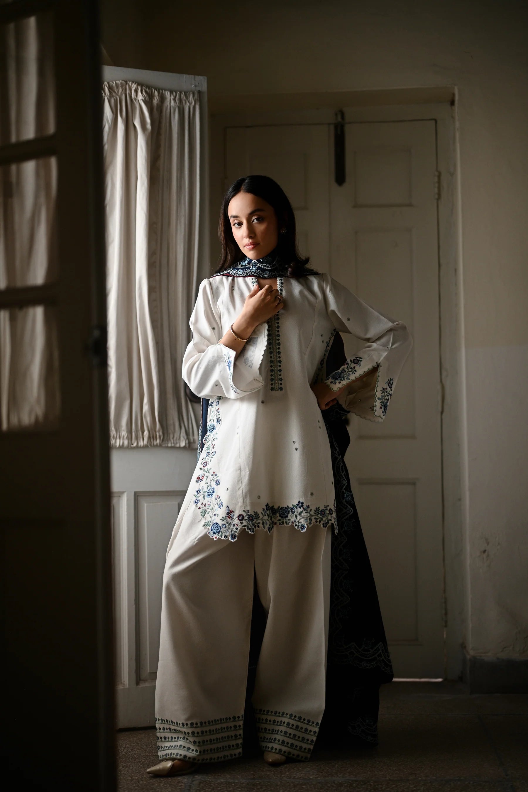A refined white three piece karandi ensemble that radiates understated luxury. The shirt features intricate blue and lilac floral embroidery along the borders, sleeves, and hemline, enhanced with delicate lace detailing for a graceful finish. Its soft karandi fabric offers both comfort and elegance, perfect for winter wear. Paired with wide-leg embroidered trousers and a contrasting embroidered shawl, this outfit beautifully combines sophistication and tradition, making it ideal for daytime elegance or evening gatherings.