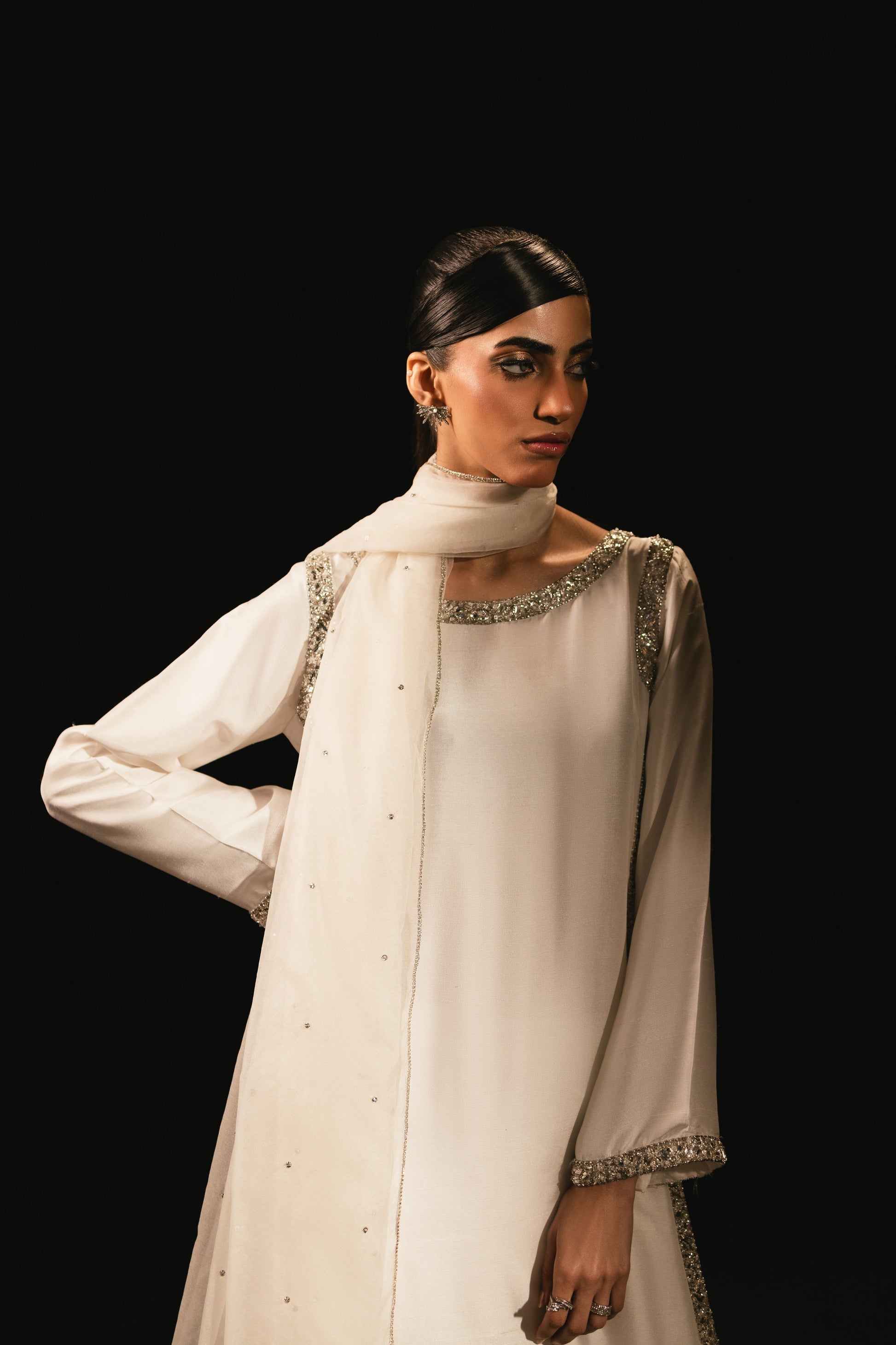 Elevate your style with this perfect white ensemble, featuring meticulous handwork on both the front and back for a dazzling effect. Paired with a sheer dupatta, it’s the ultimate statement piece for any occasion.