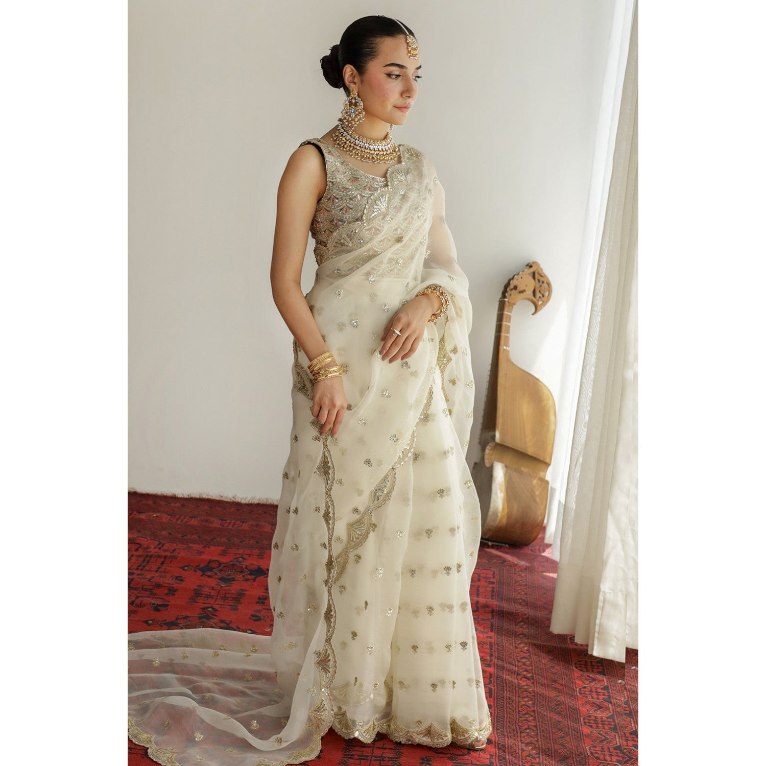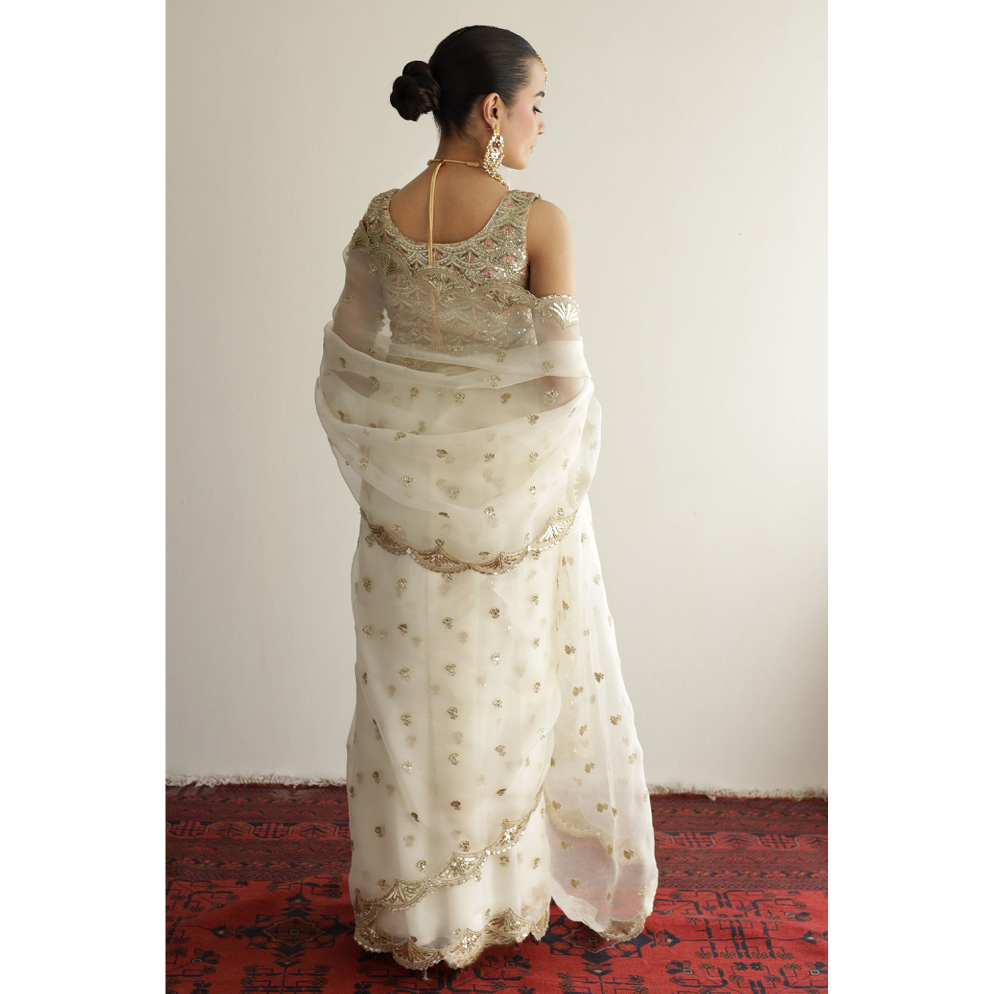 White organza saree with gold tilla, badla and sequin embroidery with multihead embroidered blouse with accent resham hints in embroidery