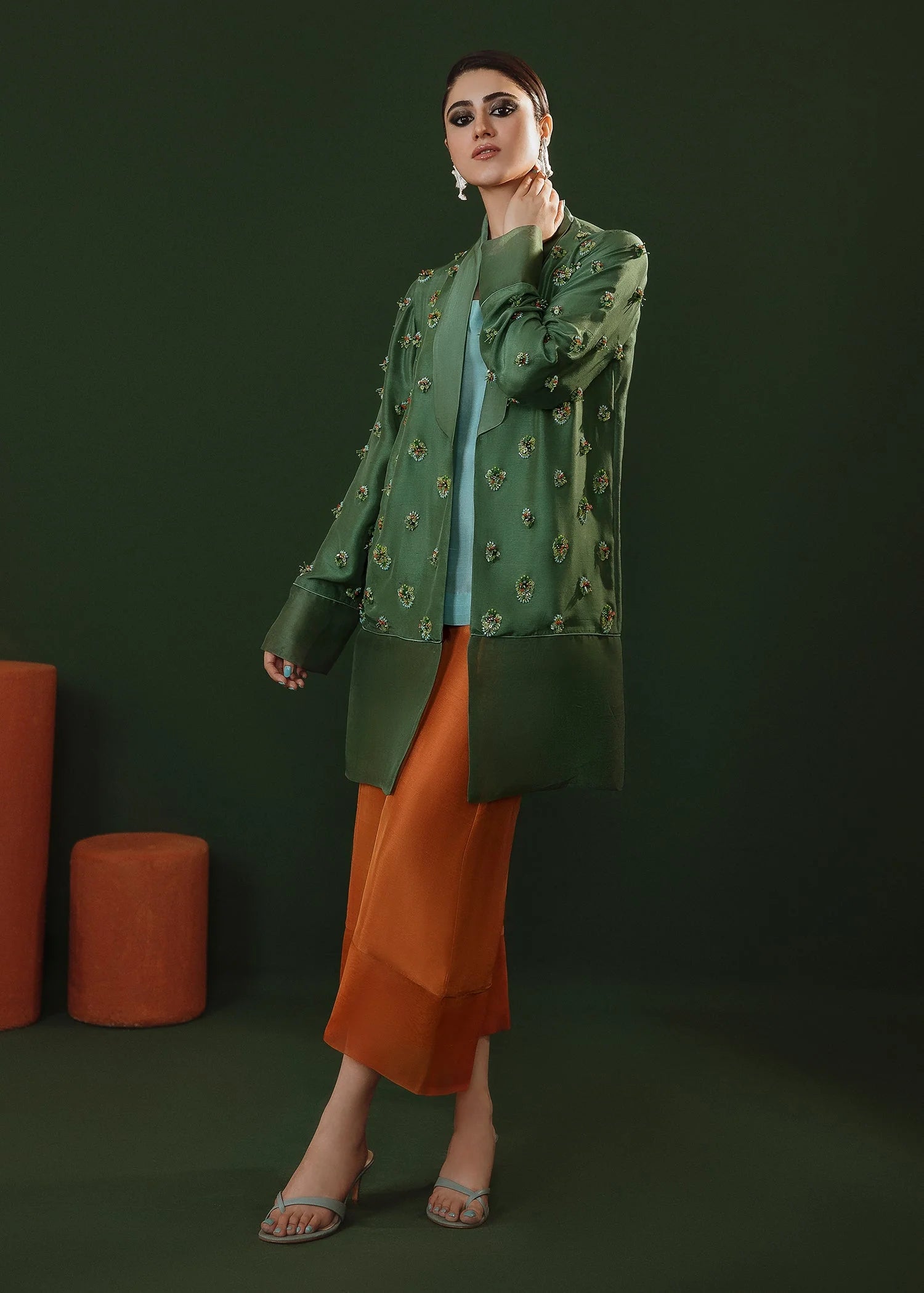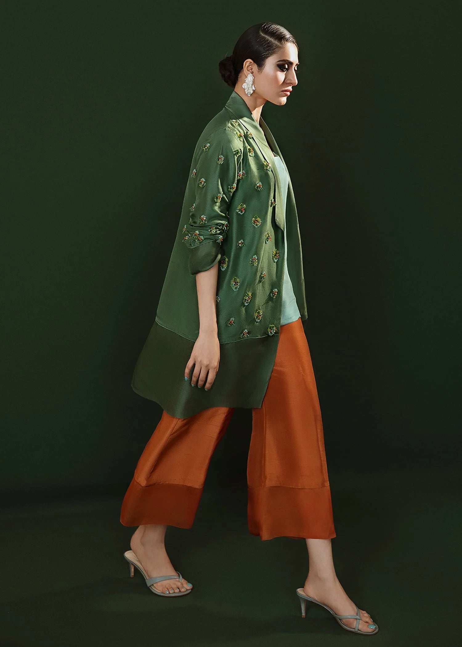 This set comes with a moss green silk jacket with hand embellishment set in clusters, paired with rust culottes and turquoise slip