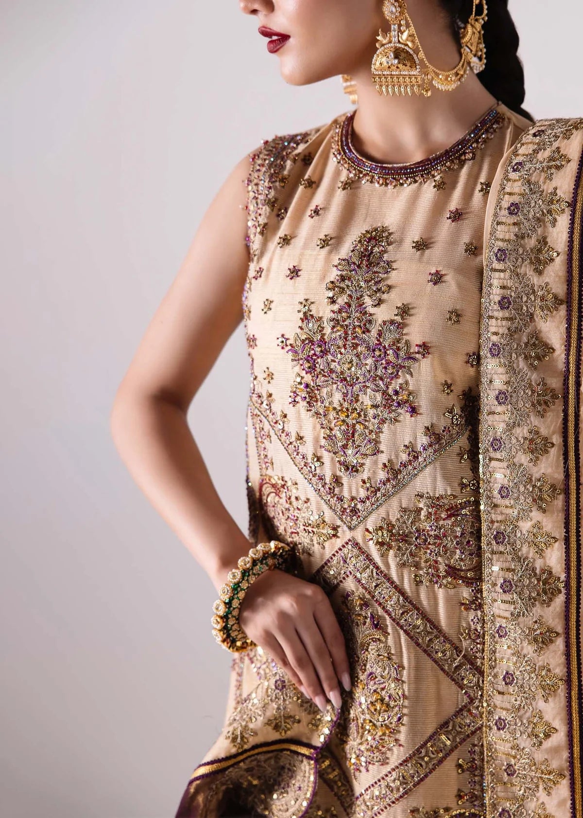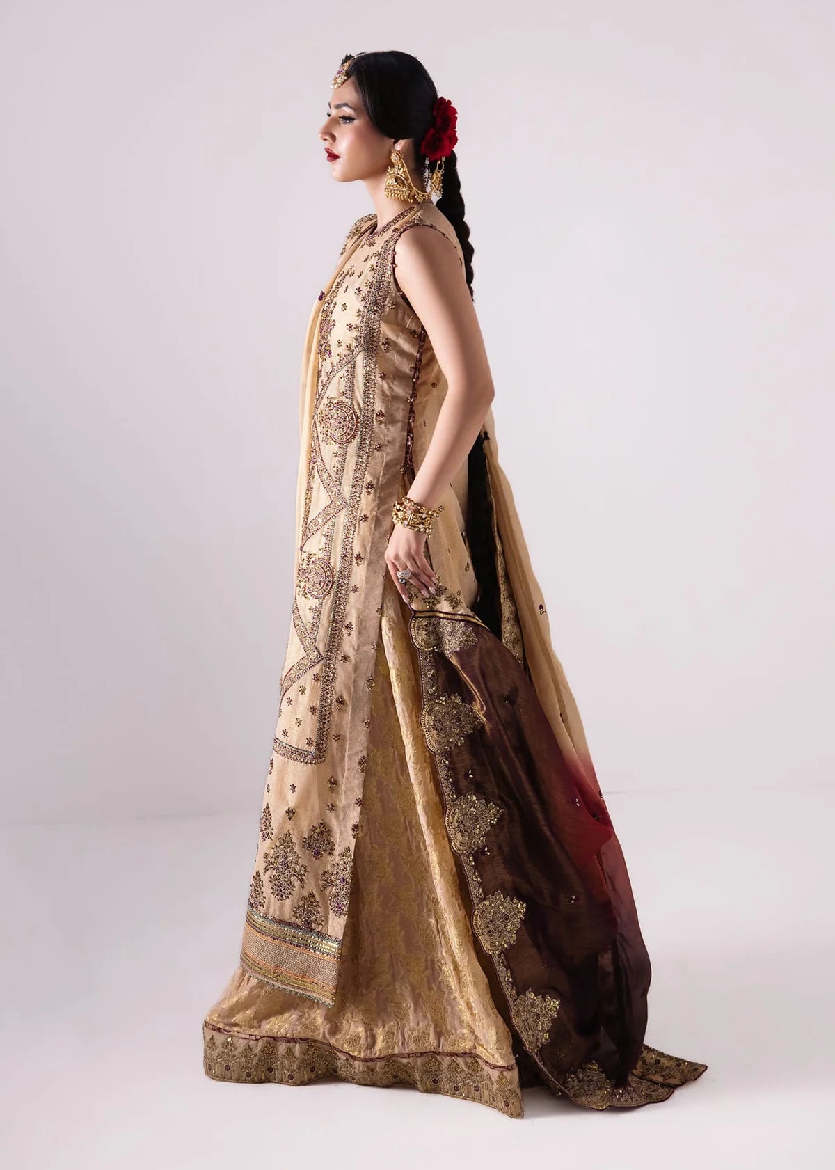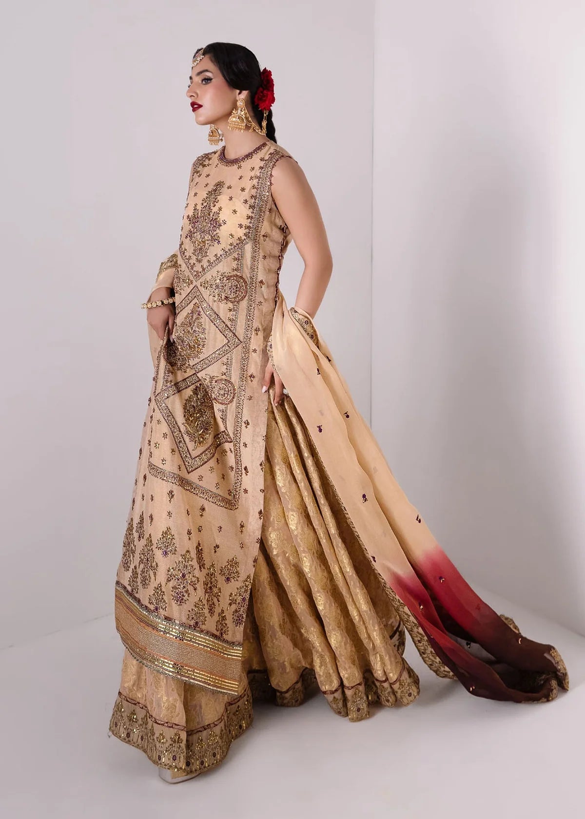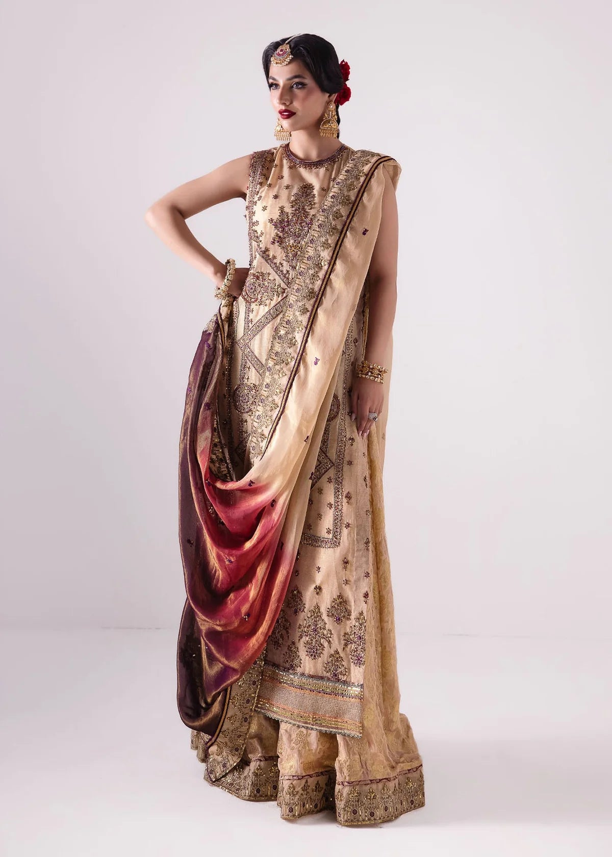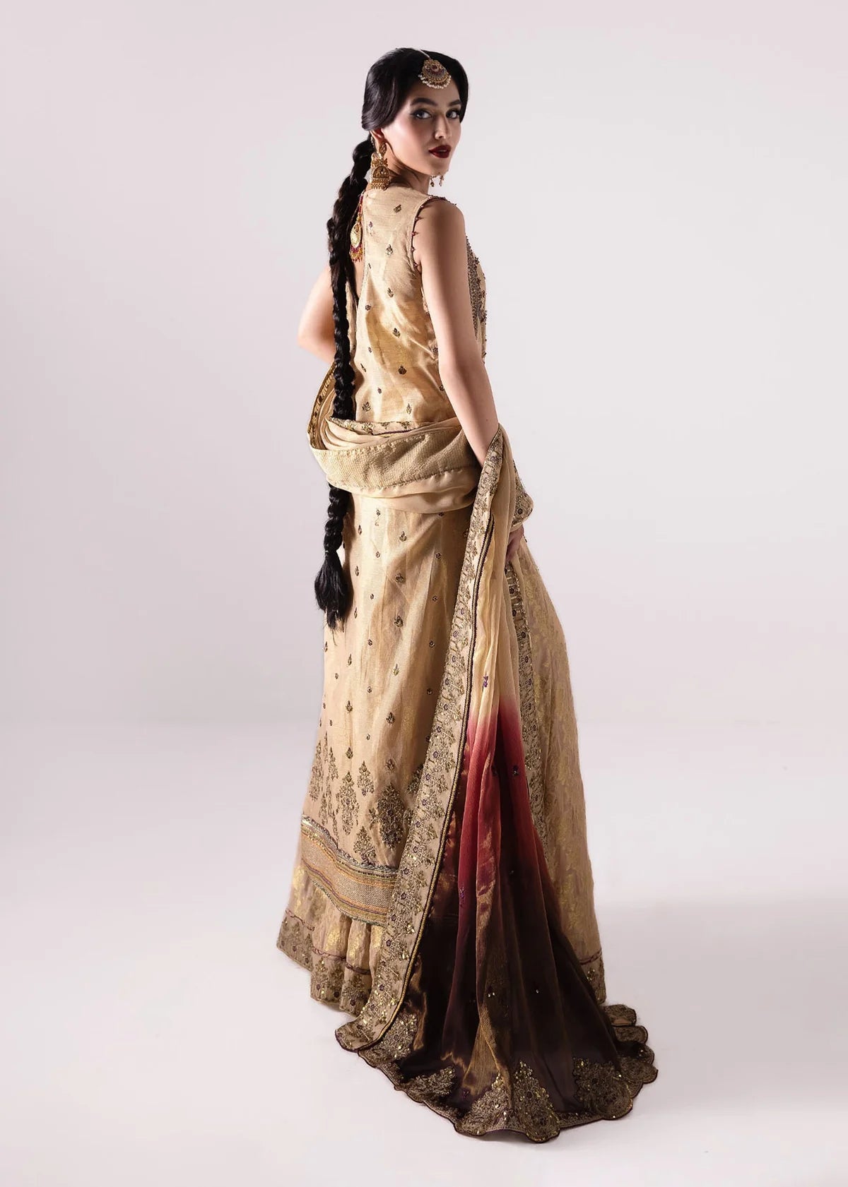 Introducing Xenia, a masterpiece of elegance and grandeur. This luxurious outfit features a rich gold base intricately adorned with detailed embroidery, blending traditional patterns with a modern silhouette. The standout feature is the ombre dupatta, transitioning from gold to deep maroon, adding a dramatic flair to the ensemble. Perfect for weddings and grand occasions, Xenia captures the essence of regal sophistication, ensuring you make a stunning entrance wherever you go.