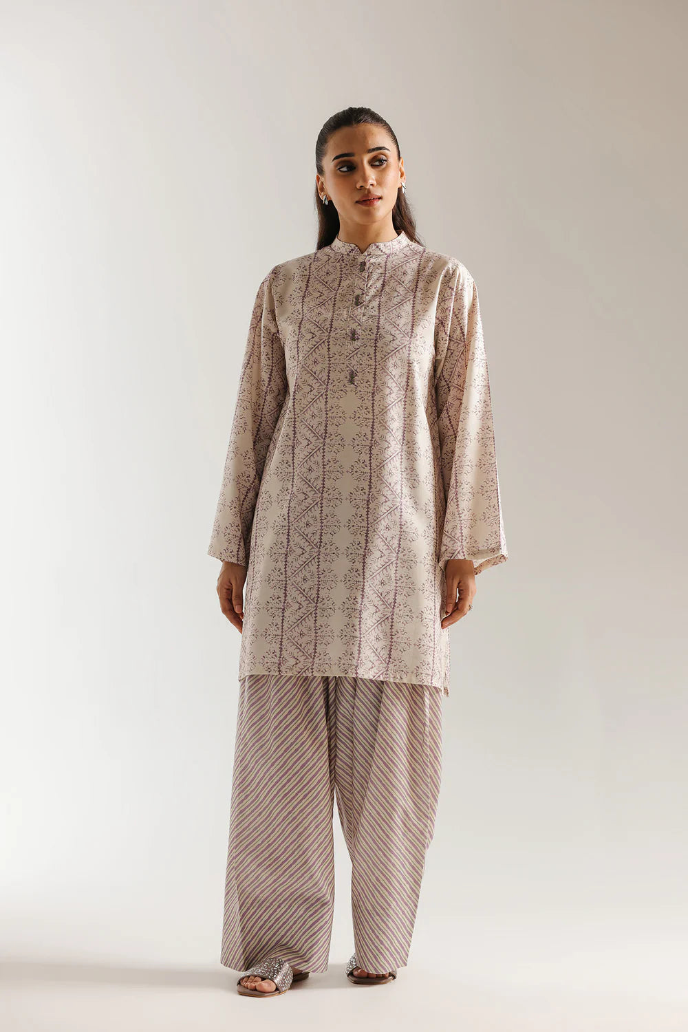 Embrace timeless elegance with this traditional printed suit, expertly crafted for versatile wear. The kurta features a refined mandarin collar with button placket and mid-thigh length, paired with full-length straight sleeves for a polished silhouette. A sophisticated geometric or Ikat-inspired pattern in mauve and dusty rose adorns the cream base, creating visual interest without overwhelming the design. The coordinating wide-leg shalwar showcases complementary striped detailing in matching tones, ensuring a cohesive ensemble. Ideal for casual gatherings, semi-formal occasions, or everyday elegance, this two-piece set combines comfort with authentic South Asian craftsmanship, making it a versatile addition to any wardrobe.