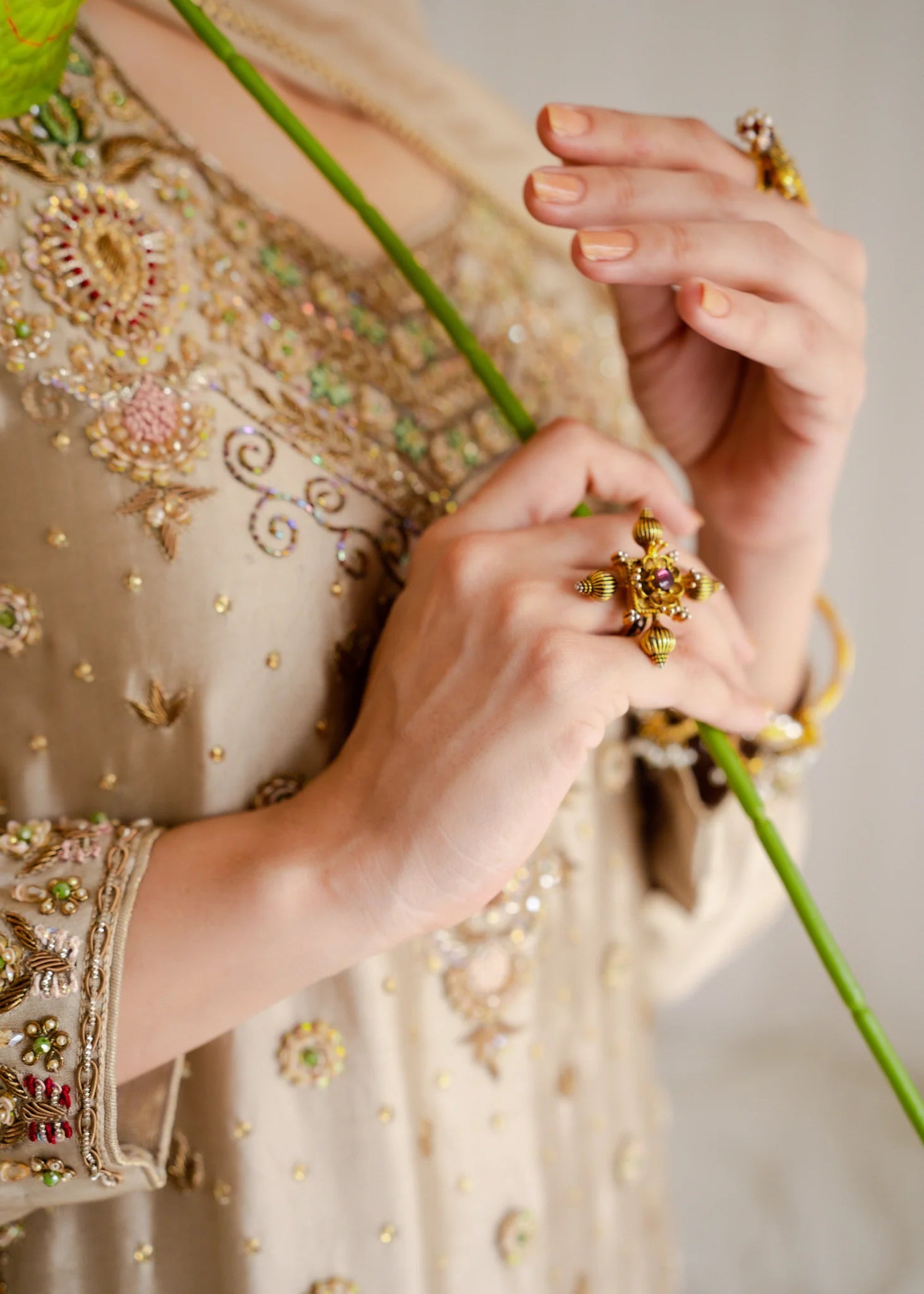Draped in gold beige sheesha silk, Zareen embodies quiet luxury. Hand-embroidered with dabka, sequins, and touches of resham in green and red, it reflects classic craftsmanship with modern grace. Paired with raw silk trousers and a soft, sequined dupatta, this long, slim-sleeved silhouette radiates timeless sophistication, effortlessly regal, endlessly refined.