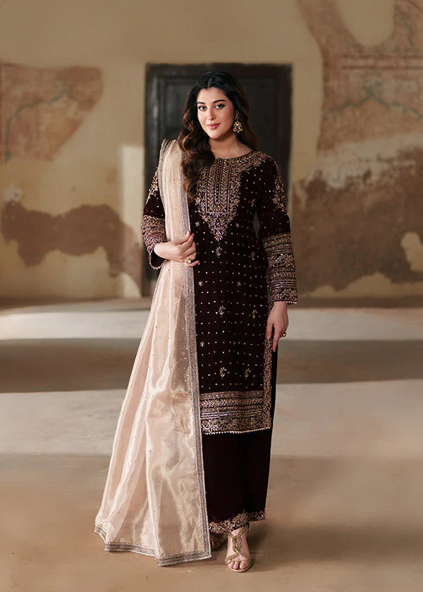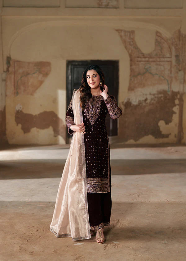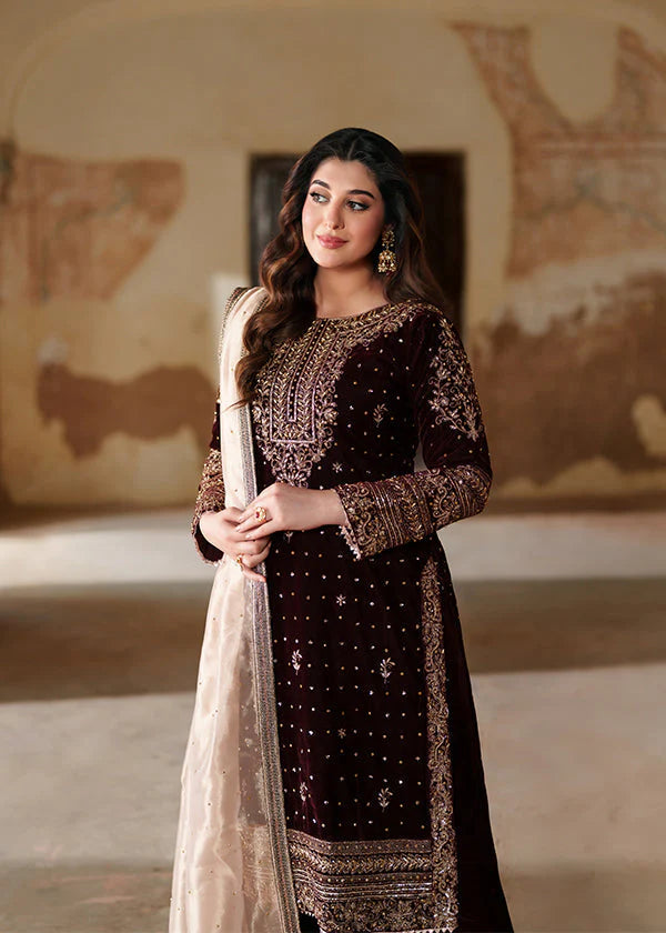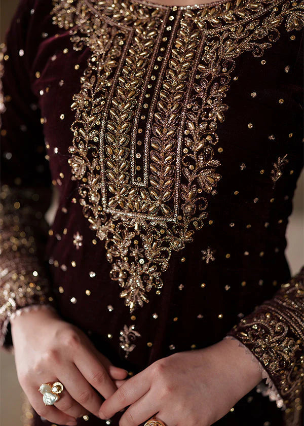 Where heritage whispers through velvet folds and every stitch sings of timeless grace. Cloaked in a deep maroon hue, this hand-embellished masterpiece evokes the quiet grandeur of old palaces, where queens once walked in silence and splendor. The delicate champagne dupatta falls like moonlight over mahogany, soft, radiant, eternal. Every thread, a prayer; every motif, a memory. Crafted not just to be worn, but to be remembered. ✨