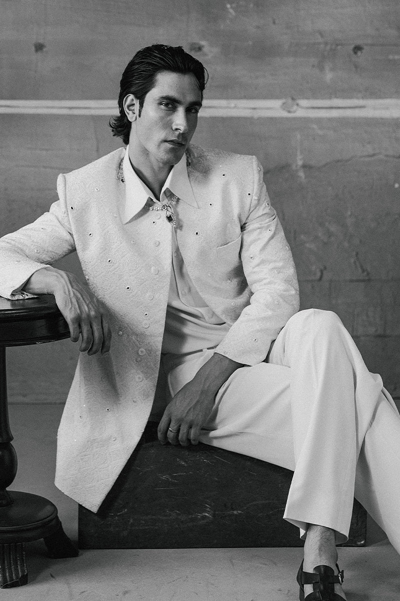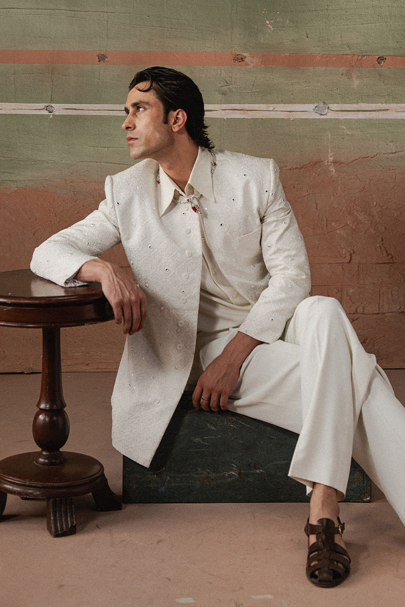 An ash white embroidered Prince jacket in raw silk fabric, further enhanced with delicate sequins and mirror work.
