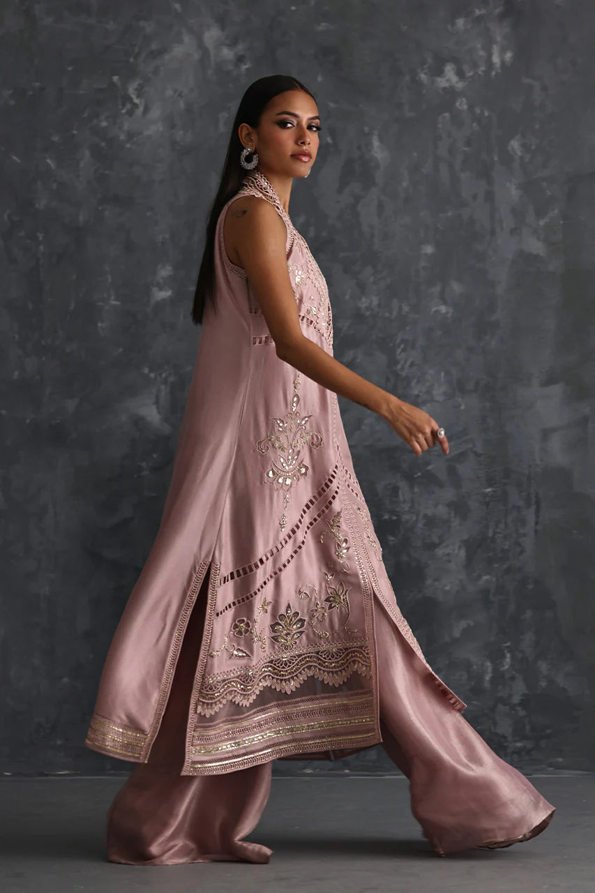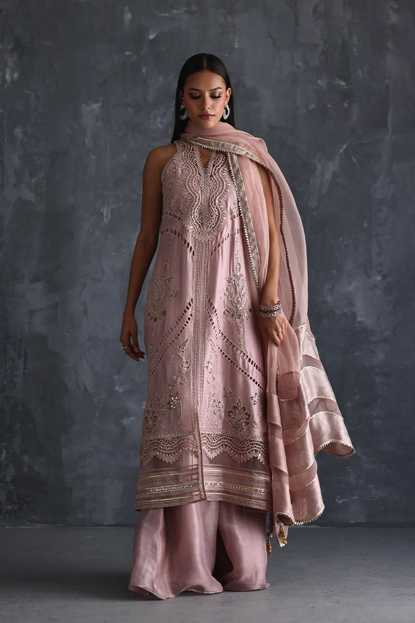 This pink raw silk long shirt is an epitome of grace and royalty! It features stunning applique and cutwork, zardozi and gotta work and intricate kamdaani along the front open shirt! The neckline glistens and stands out with statement laces embellished with gotta sprinkle. A pure organza dupatta with meysuri scallop detail on palloo along with exaggerated two legged pants add the oomph for all the festive feels this season!