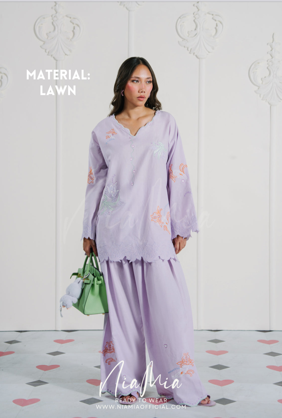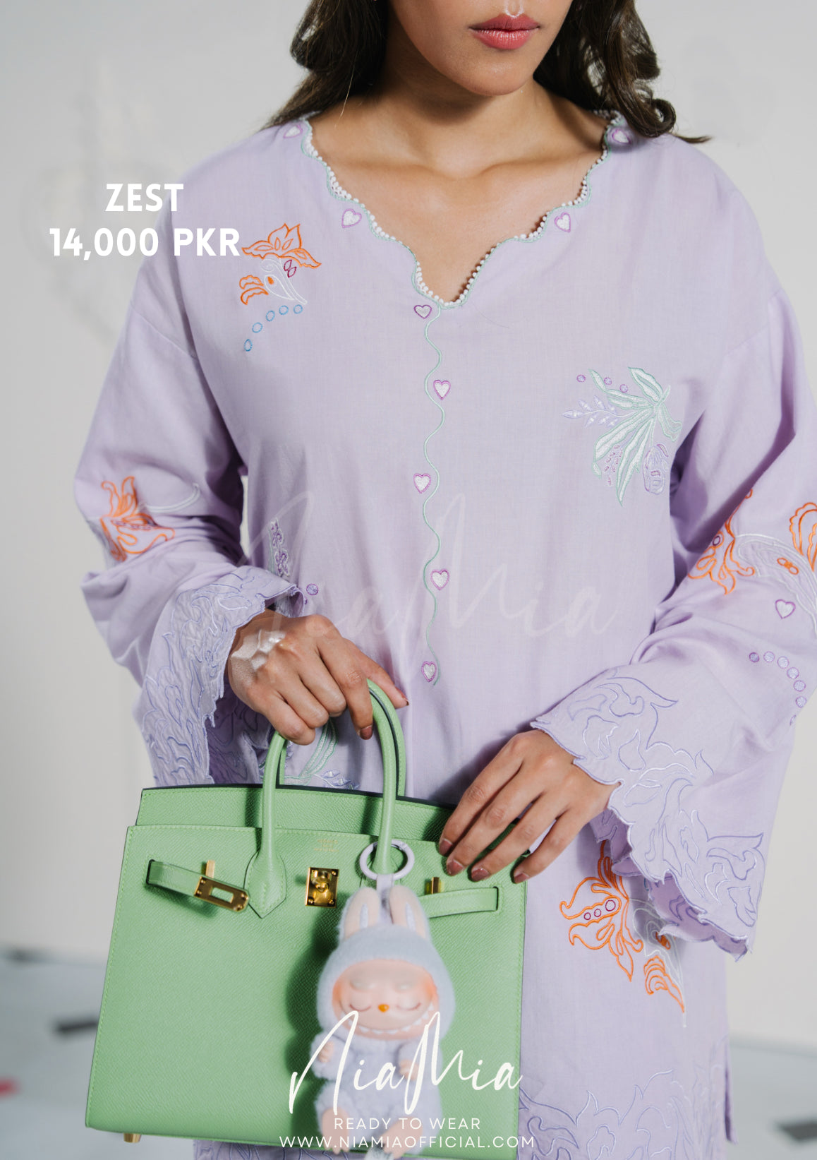 A two-piece printed set in soft shades of pink with delicate tonal motifs. The collared neckline adds a tailored touch, while cutwork embroidery details the sleeves and shirt hem. Paired with a flowing farshi shalwar for an elegant yet relaxed summer look.
