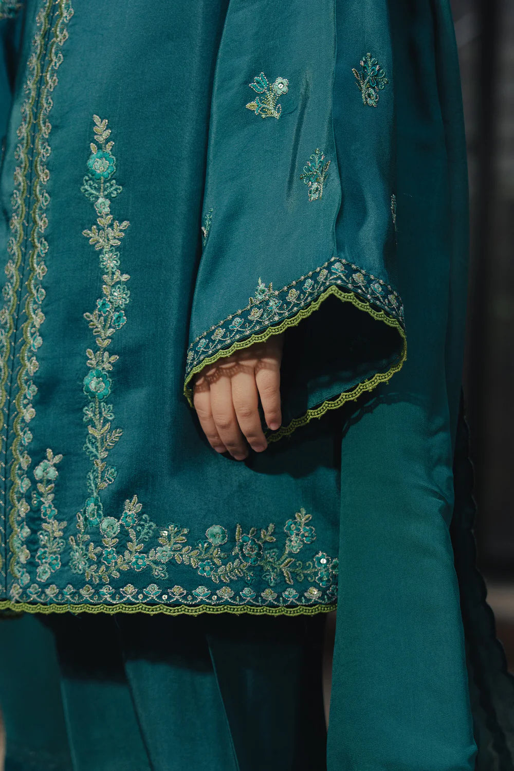 Modern silhouettes meet intricate detailing in this zinc three-piece, styled with an embroidered short shirt, tapered shalwar, and scalloped dupatta.