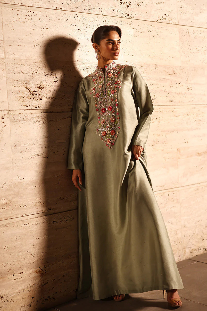 The kaftan’s flared silhouette shines with vibrant embroidered florals blooming along the neckline, shimmering softly with hand-adorned sequins, beads, crystals, and silver zardozi. The sage khaddi silk shella, adorned with handmade tassels on the pallus, offers texture and a gentle echo of the kaftan’s palette, completing a composition that feels effortless yet refined.