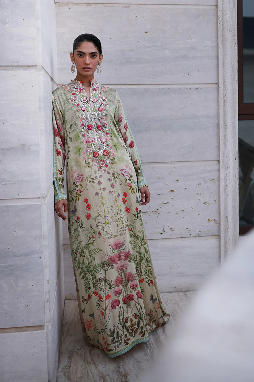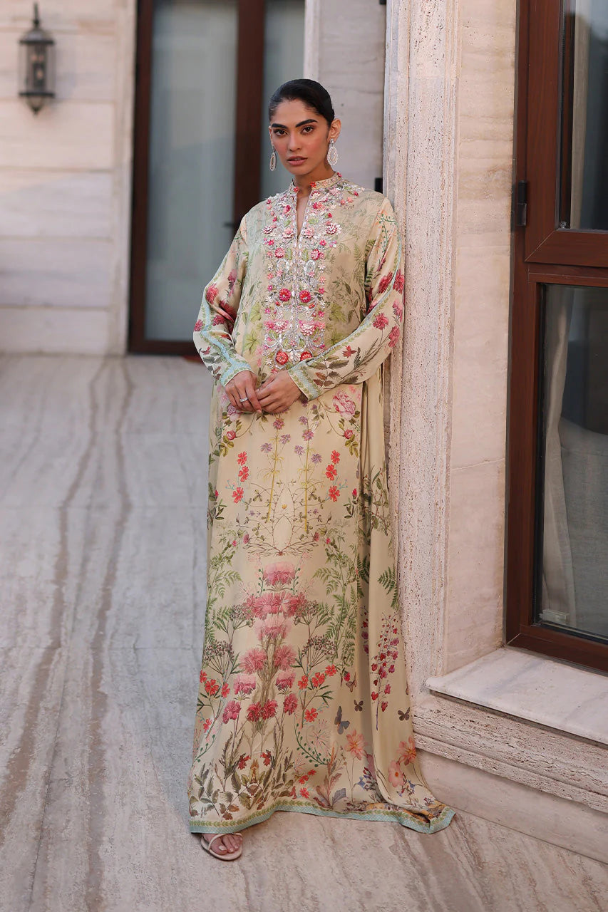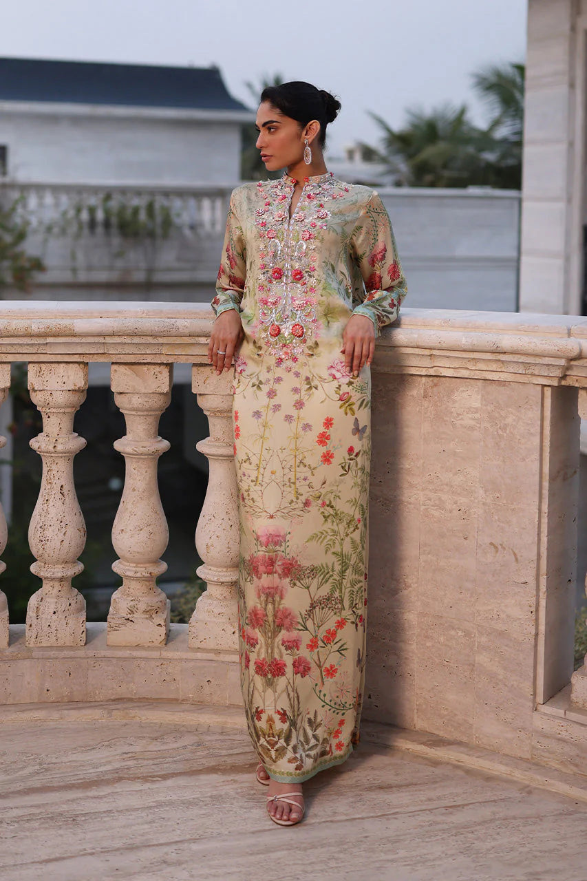 This ensemble is celebration of masterful handwork in a traditional form. The lemon yellow organza kalidar, adorned with delicate florals clustered around the neckline, hand-embroidered and accented with zardozi, sequins, and dimensional flourishes. Chevron-like edging along each seam add a subtle layer of texture and visual rhythm. Paired with a lemon yellow organza dupatta edged with trims, and matching pure raw silk pants, the set balances craft and structure, offering a look that is both classic and refined.