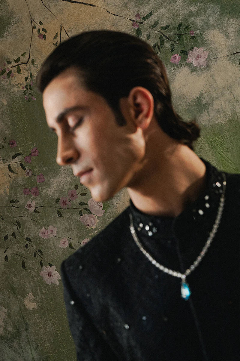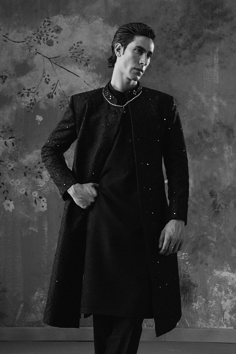 Onyx black embroidered sherwani adorned with all over midcentury floral embroidered pattern , featuring subtle sequin accents and a hand embellished mirror-work band collar. Crafted in rich Jamawar fabric.