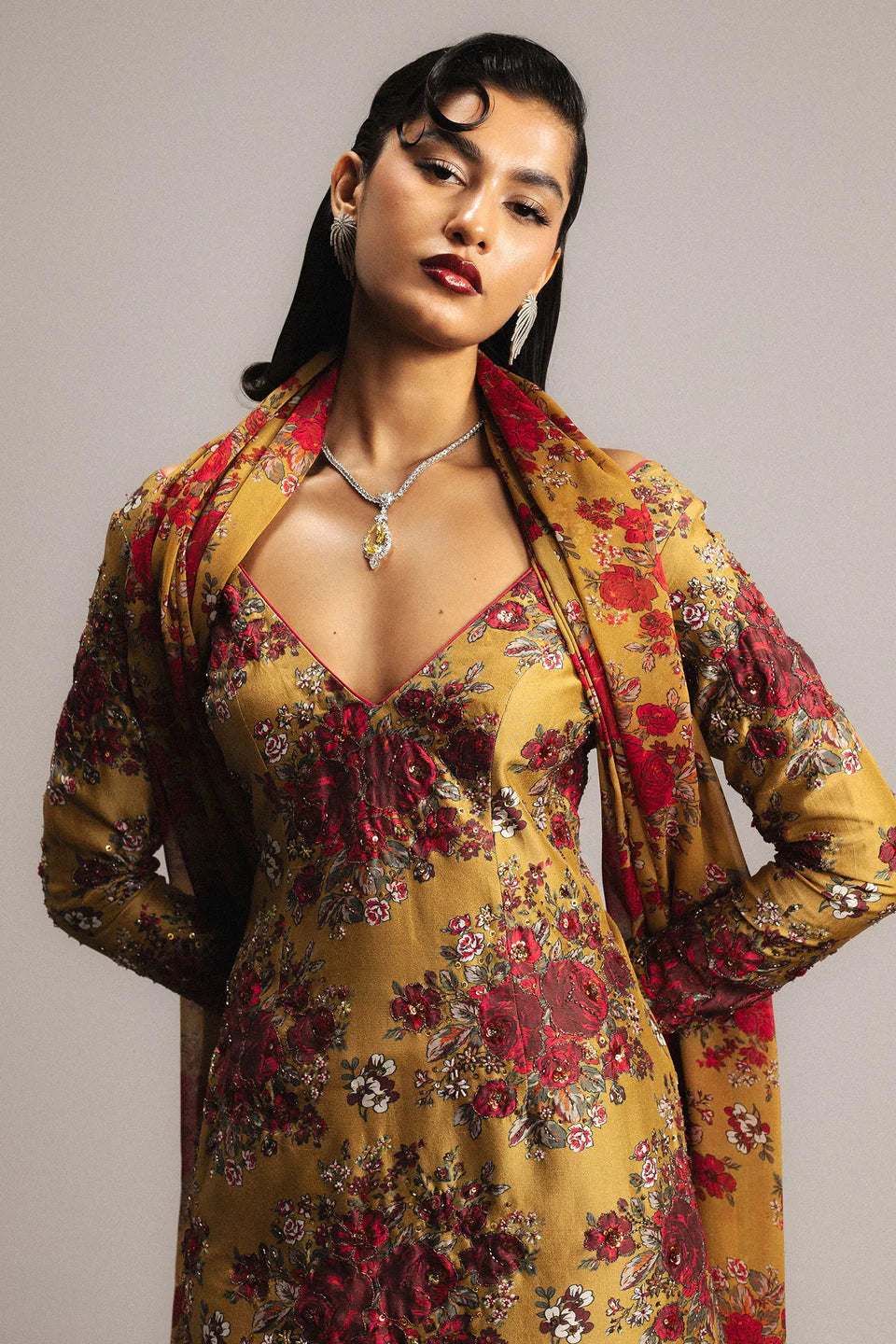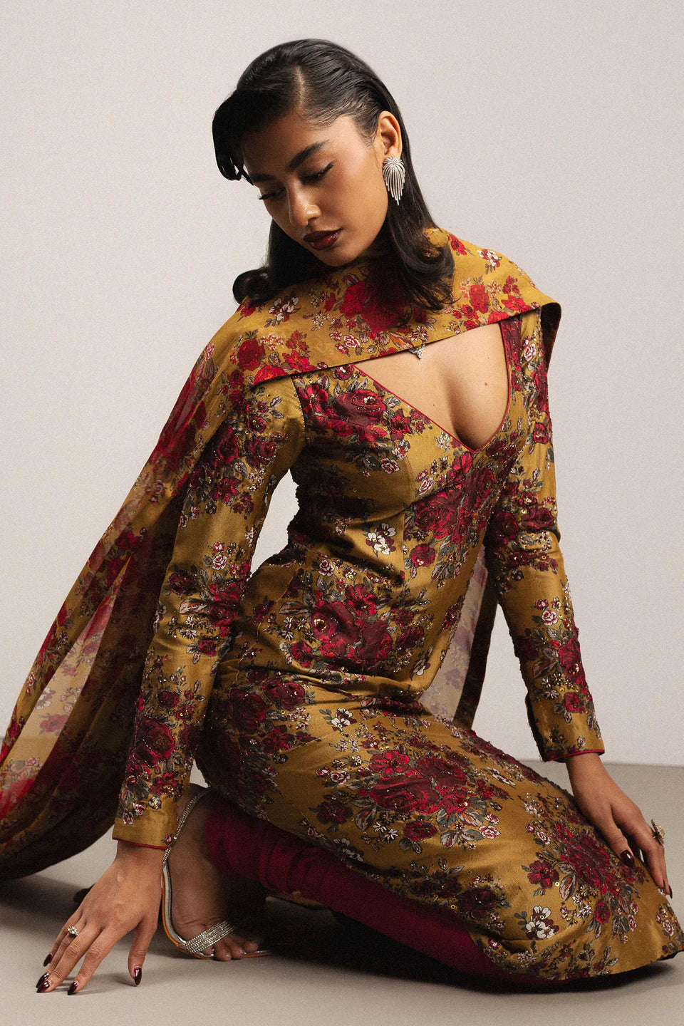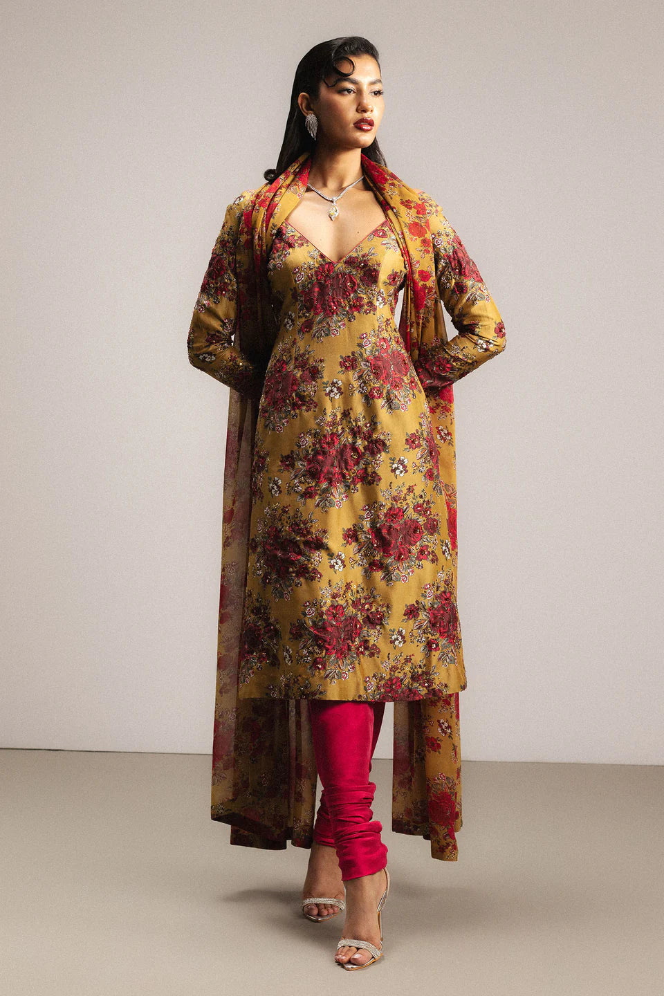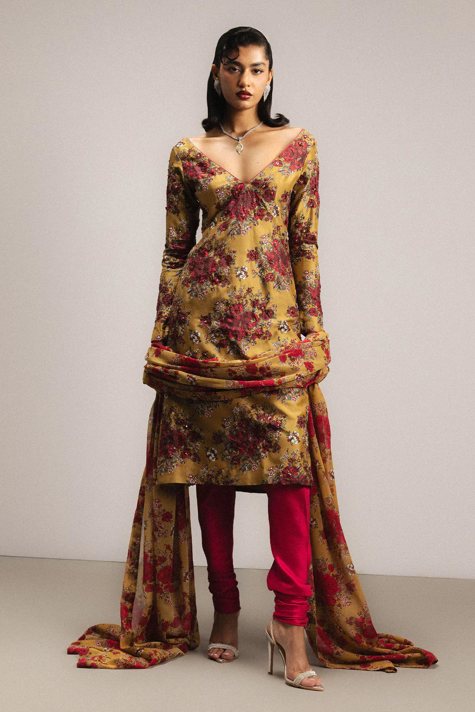 A pure raw silk printed olive mid-length shirt featuring deep front and back V necklines and fitted sleeves, adorned with delicate hand embellishment for an elegant finish. It is paired with a contrasting pink churidar pajama and a pure georgette chiffon floral printed dupatta, creating a timeless festive look.