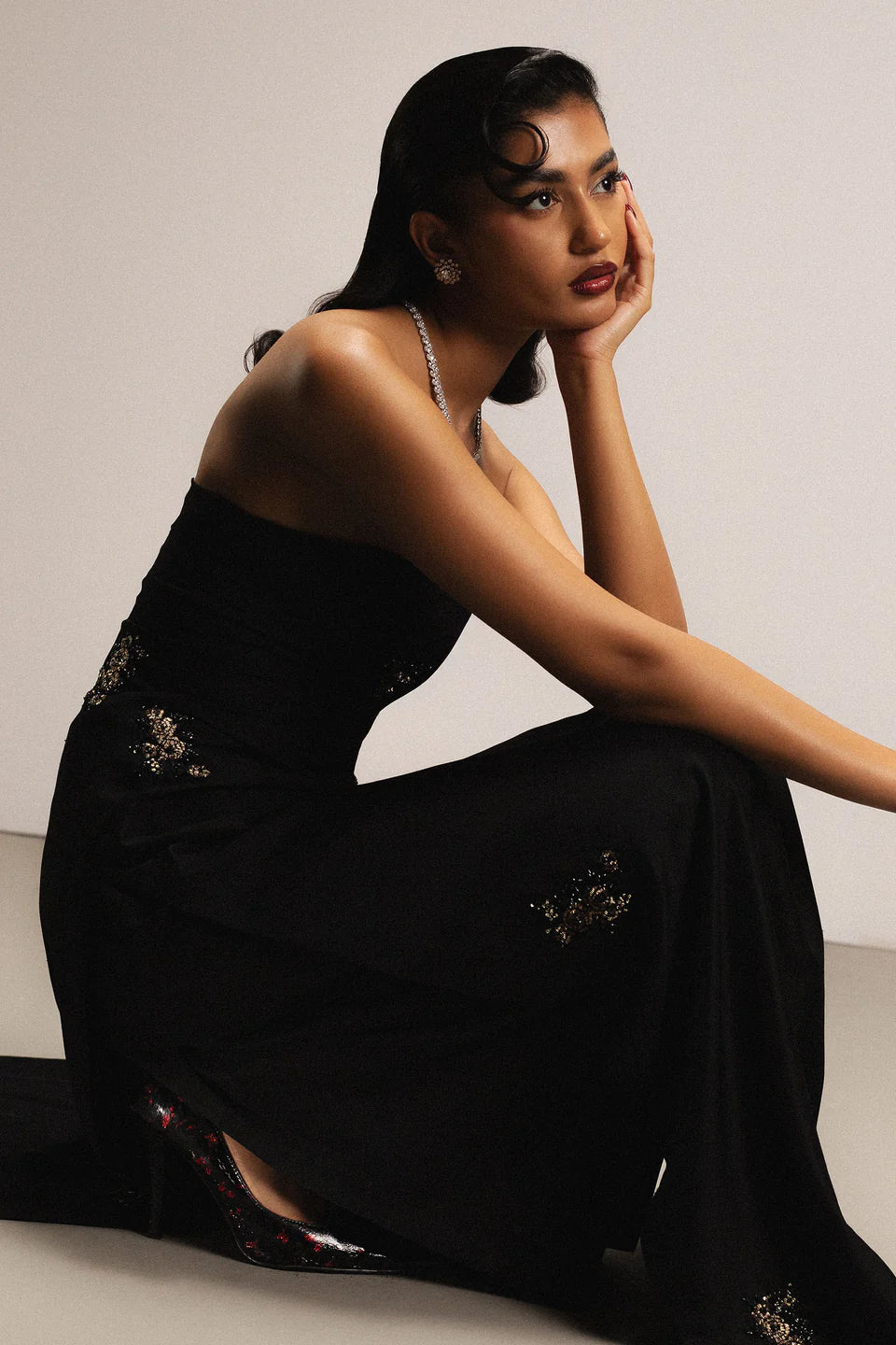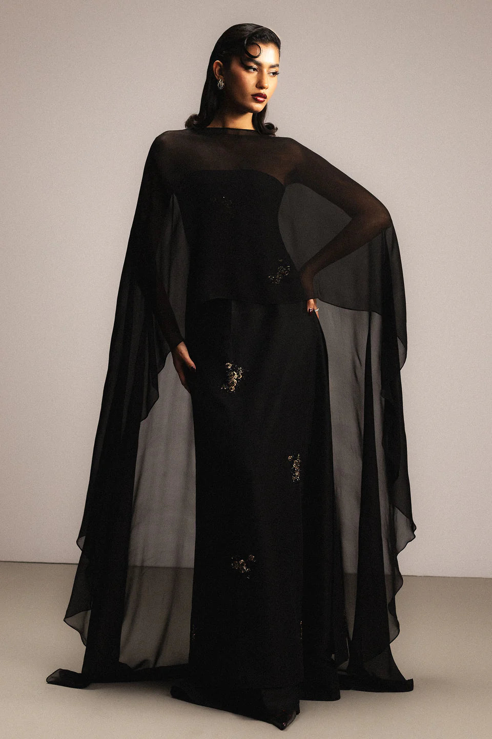 An all-black pure raw silk tube shirt adorned with a spray of hand-embellished golden floral motifs, paired with matching wide-leg trousers and layered with a pure georgette cape, creating a bold and contemporary statement look.