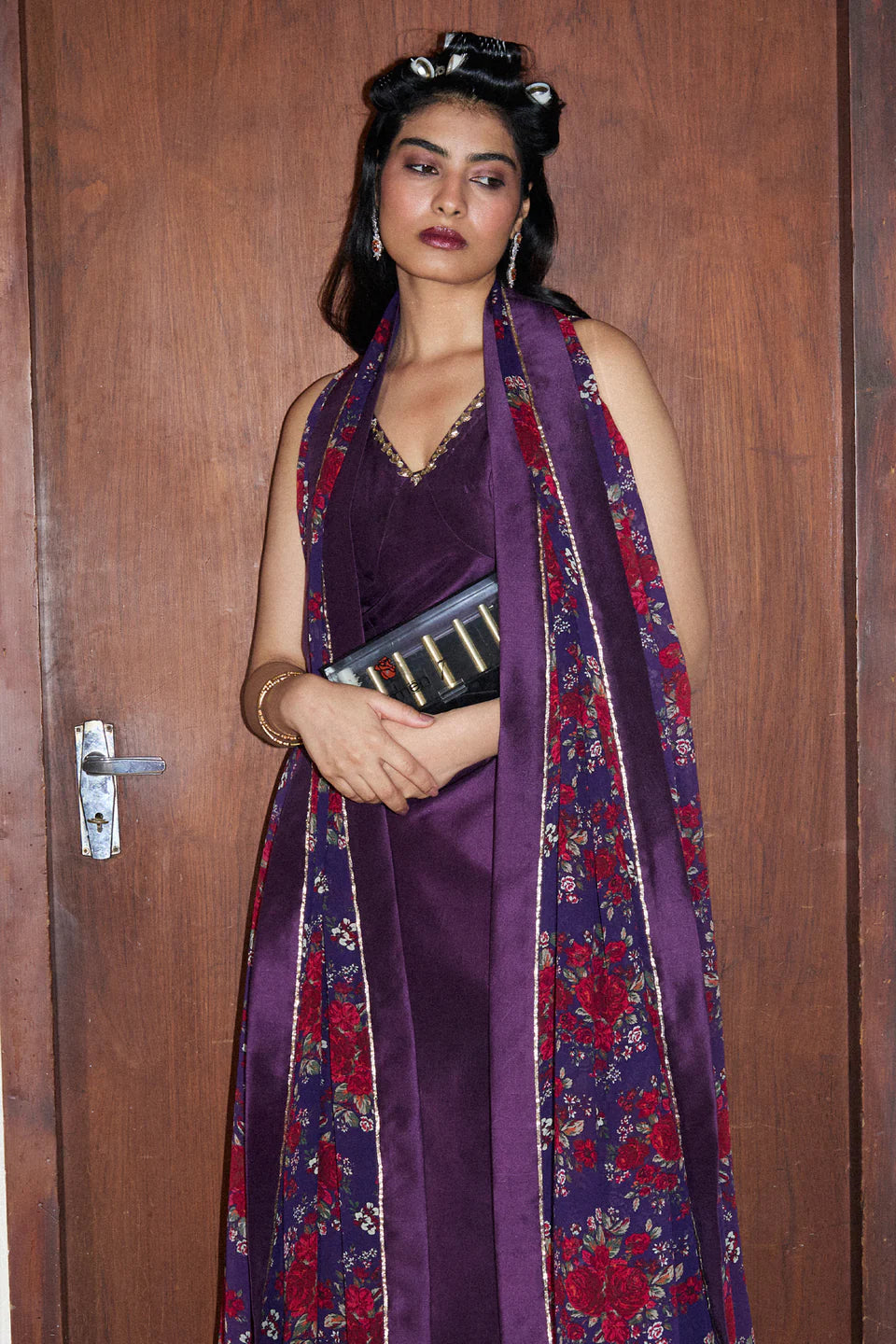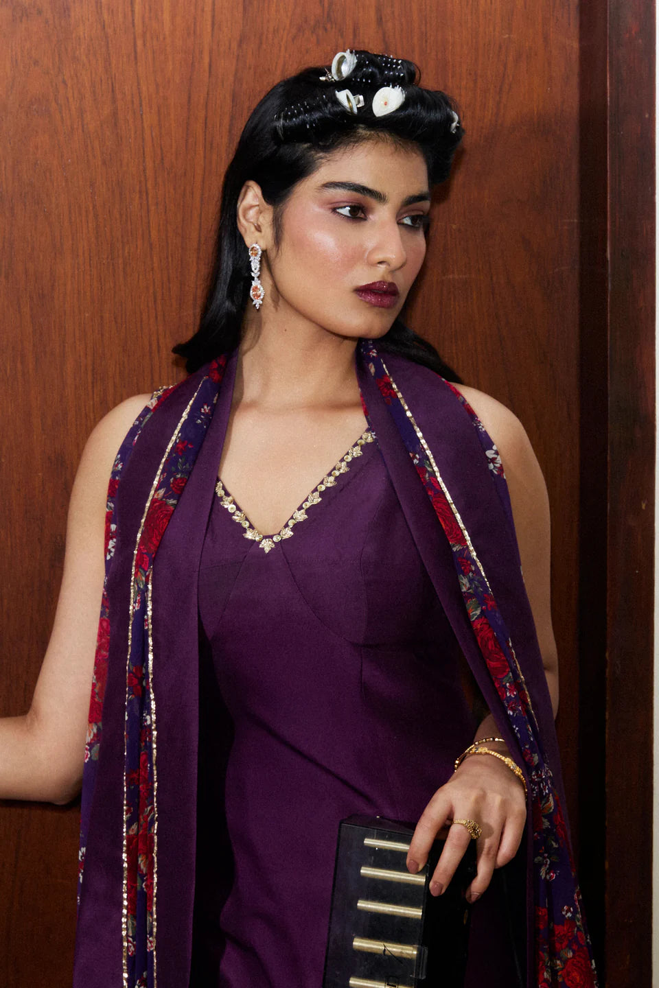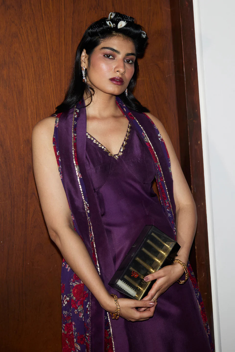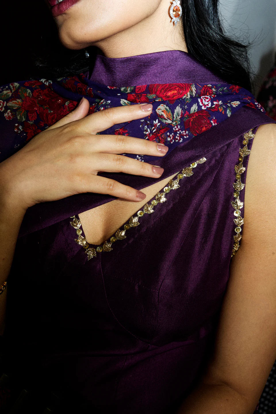 A structured silhouette in pure raw silk—sharp, unapologetic, and refined. The border-fitted shirt and wide-hem pants hold their own, while a classic floral georgette dupatta, touched with hand embellishments and silk detailing, brings softness to strength. This is tradition, claimed on your own terms.