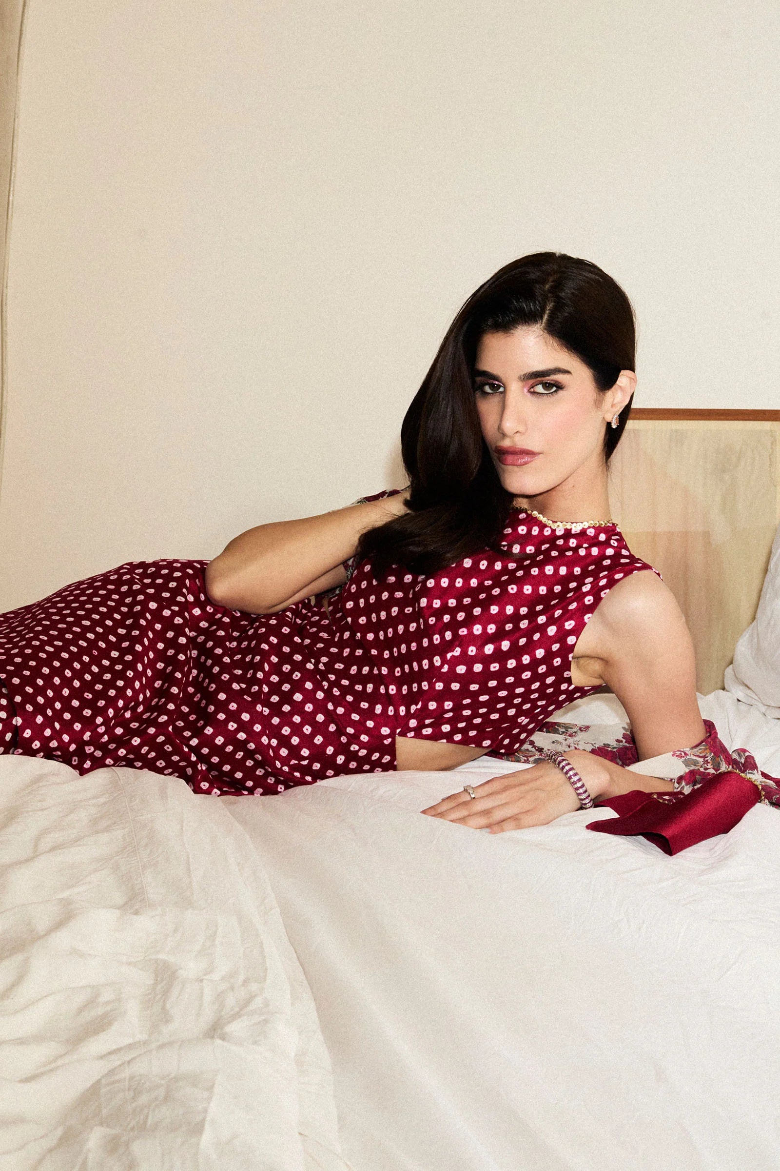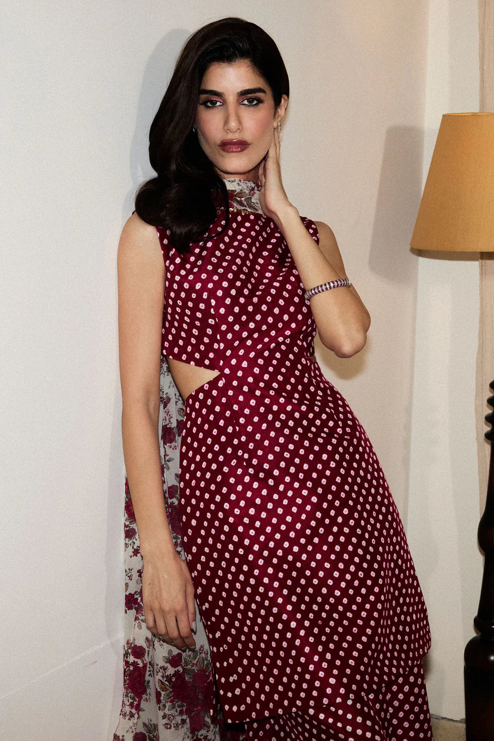 This body-grazing bandhani shirt in pure raw silk is shaped with sharp cutouts and anchored by handworked adda detailing at the back—a quiet rebellion in thread. Paired with wide-hem trousers and a fluid floral dupatta, it’s a silhouette that softens without yielding.