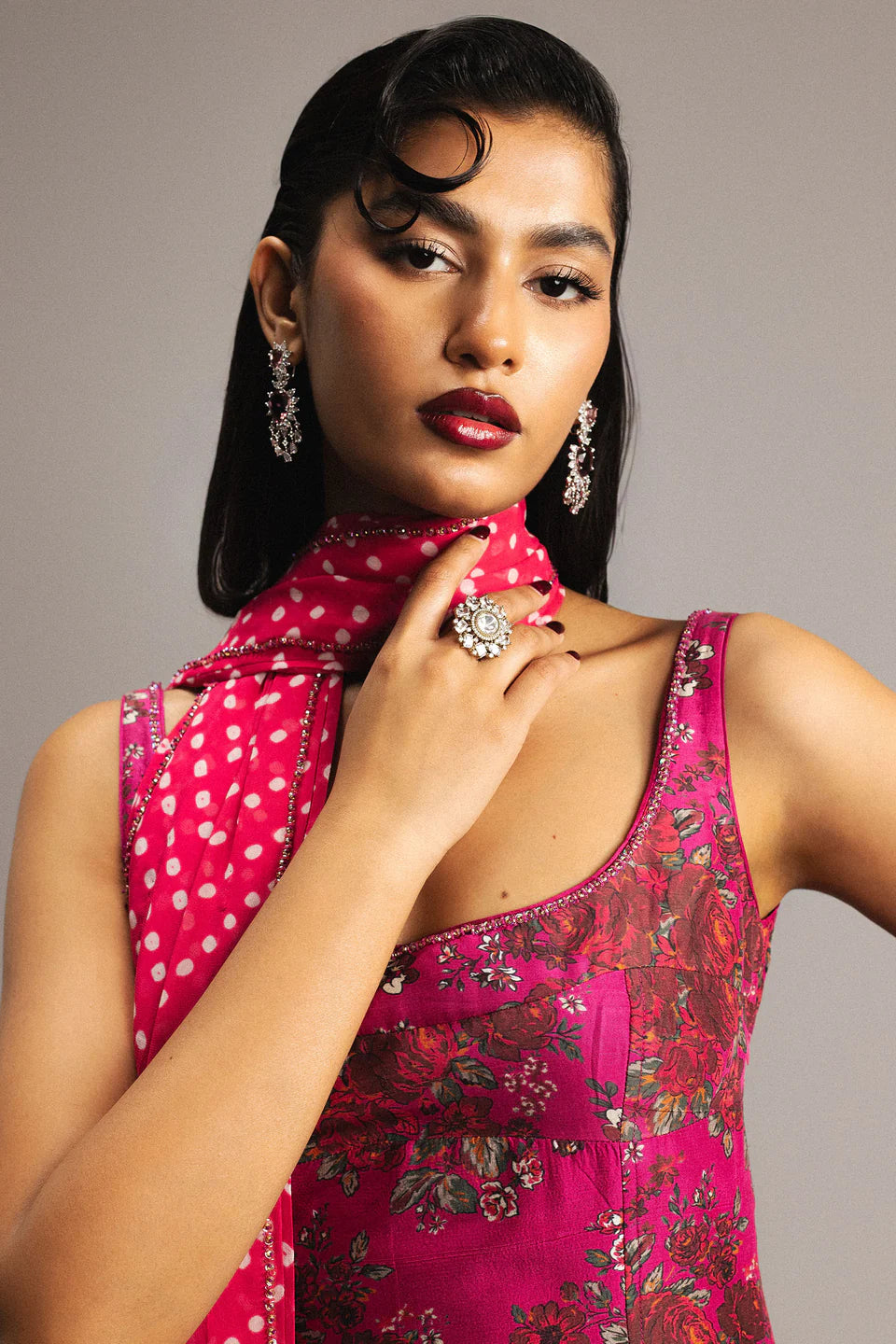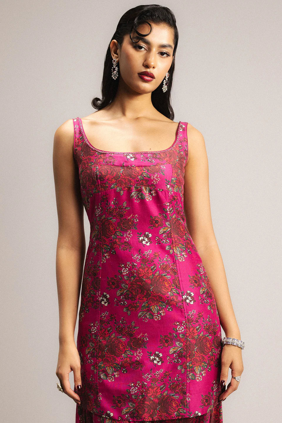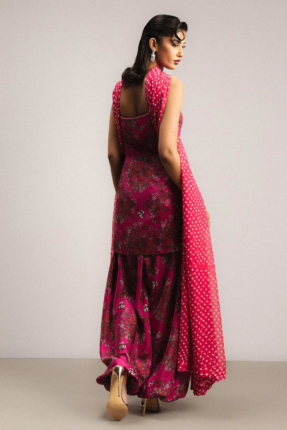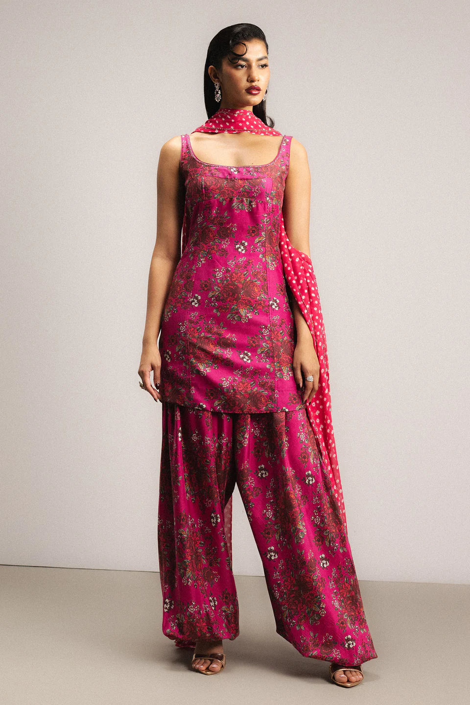 A hot pink printed floral sleeveless paneled shirt adorned with delicate hand embellishment along the front and back neckline. It is paired with balloon pants that add volume and balance to the silhouette, and a pure georgette bandhni dupatta finished with intricate hand-embellished borders on all four sides.