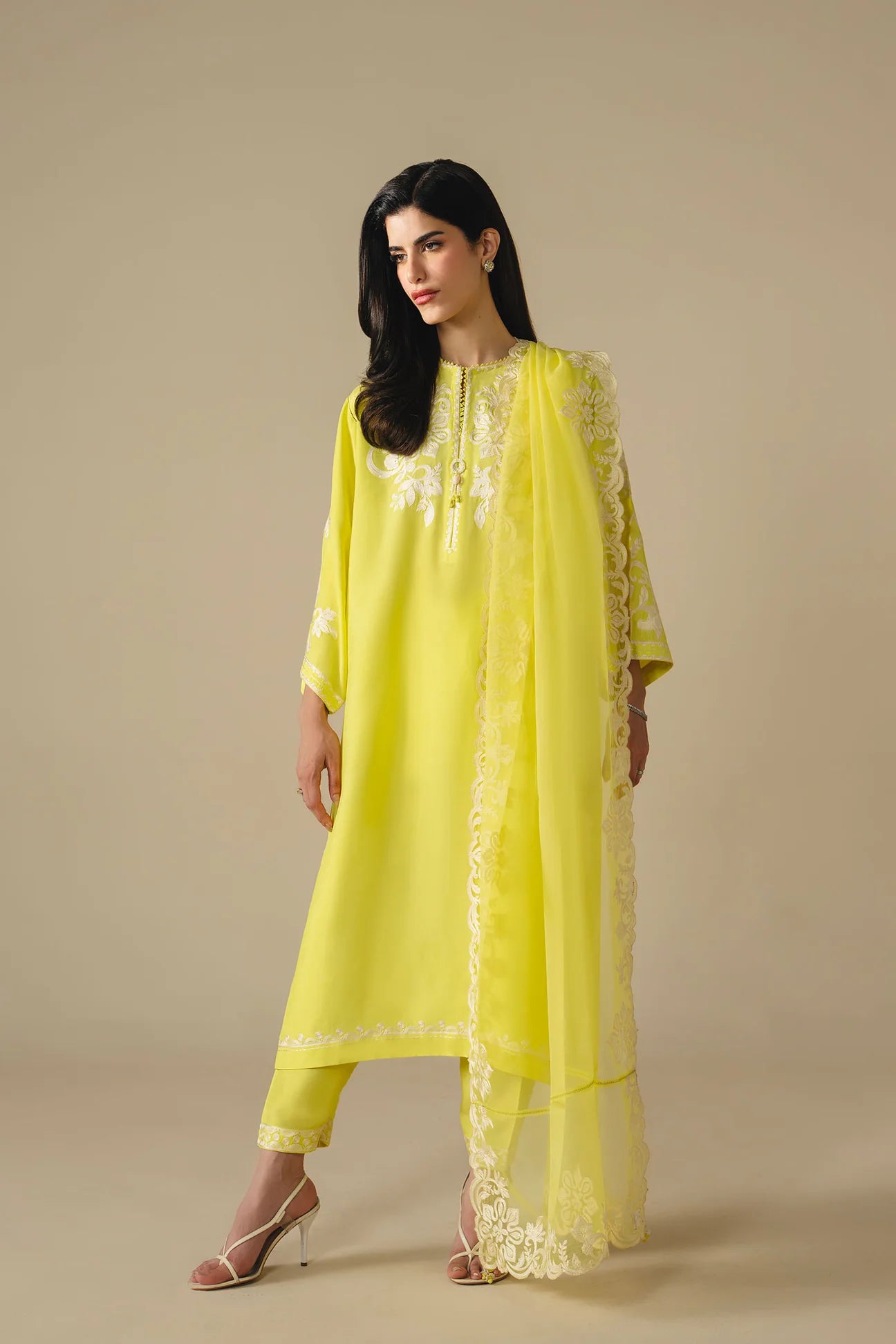 As the seasons turn, Lunarae blooms in a soft shade of sunshine yellow — a gentle ode to warmth, light, and new beginnings. Crafted from luxurious raw silk, the ensemble features a delicately embroidered floral neckline, graceful fabric accents, and playful tassel detailing. A finely embroidered floral motif adorns the back, while statement florals on the sleeves add an artful touch of charm. Paired with a tapered shalwar framed in embroidered borders and an airy organza dupatta edged with scalloped floral embroidery, Lunarae radiates soft femininity and quiet opulence — the perfect companion for fall’s golden festivities, where sunlight lingers on silk and elegance feels like a whisper.
