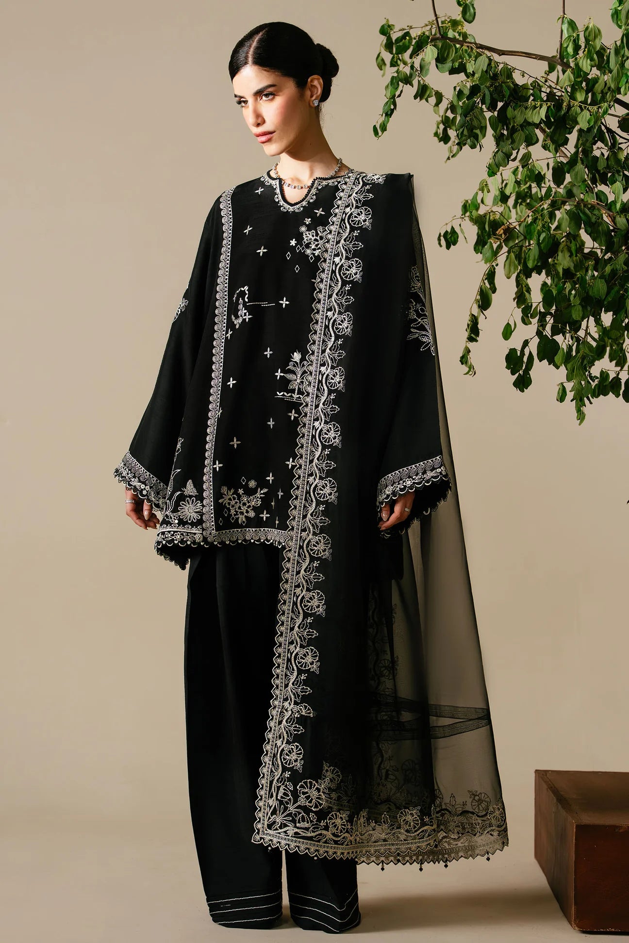 An enigmatic shade of ebony forms the canvas for Noctis, where moonlit geometry and delicate florals entwine in a dance of light and shadow. Lustrous ivory threads trace graceful patterns across the raw silk, as butterflies drift like fleeting dreams through the night sky. The look is completed with an ethereal organza dupatta, intricately embroidered in soft florals, and a tonal tapered shalwar finished with refined stitch detailing. Enigmatic, elegant, and endlessly captivating — Noctis embodies the poetry of twilight, where silk shimmers like starlight and every detail whispers quiet luxury.